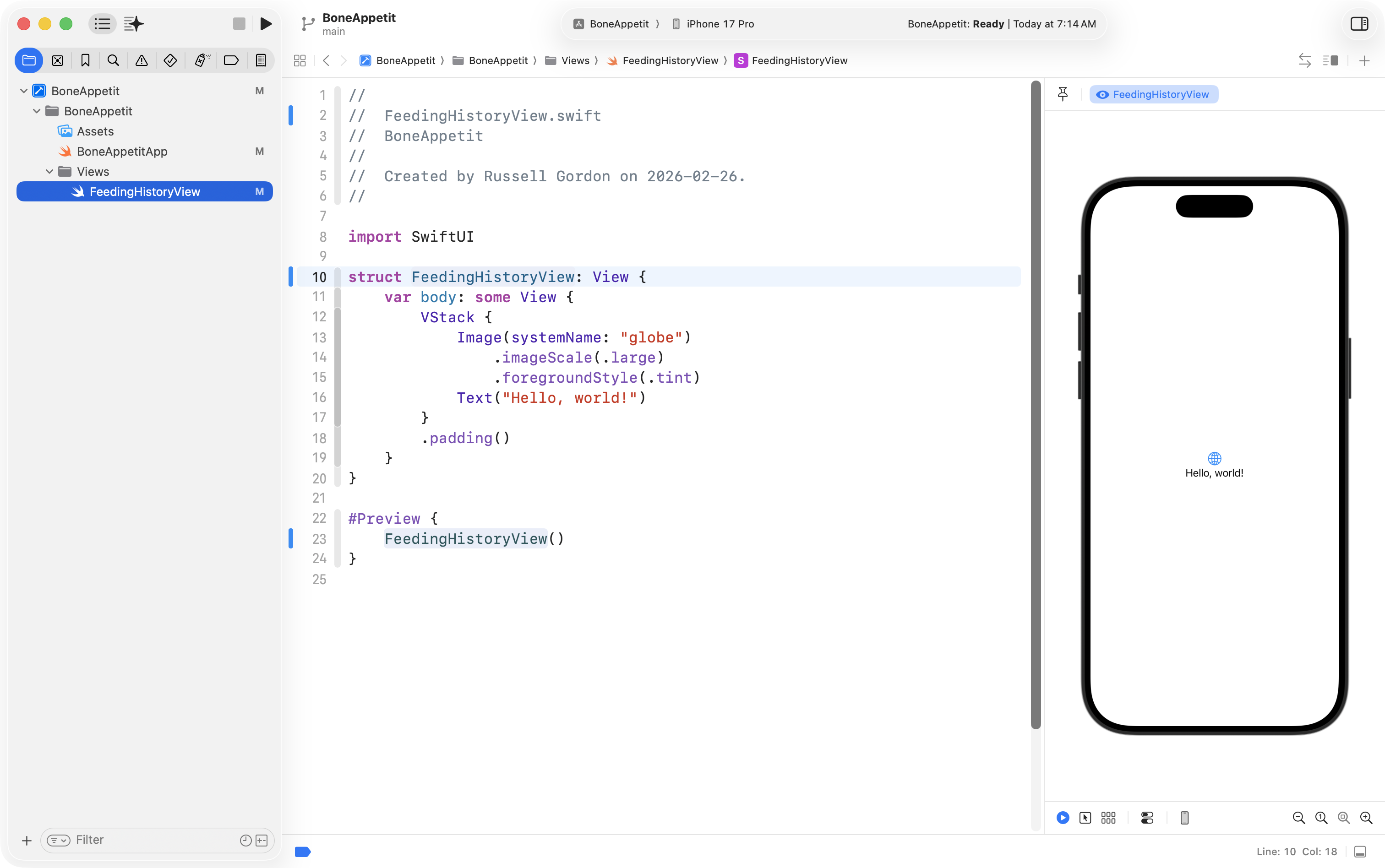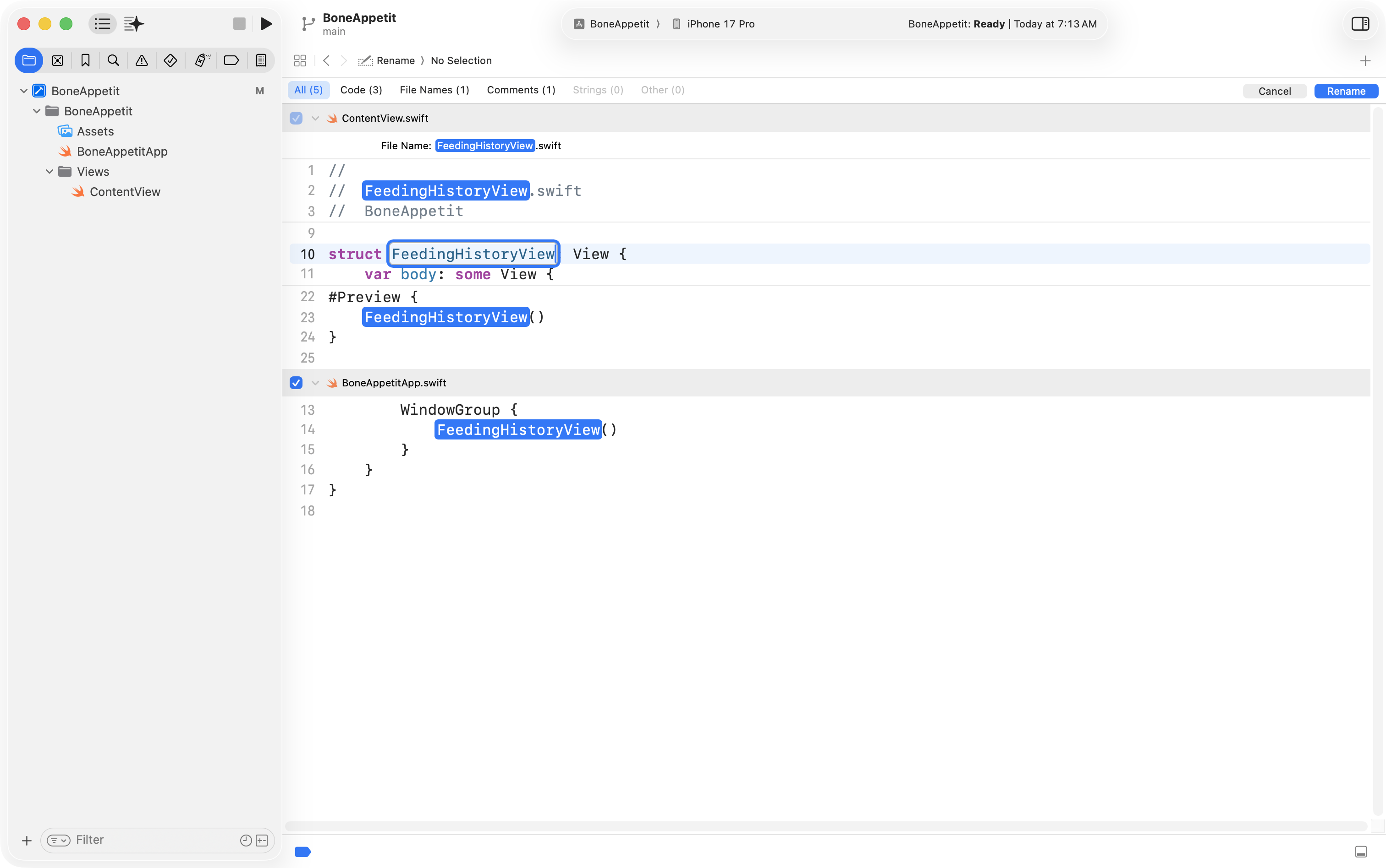 Finally, he used the Refactor > Rename feature to change ContentView into FeedingHistoryView so that the interface he will create is in a structure with a more descriptive name: