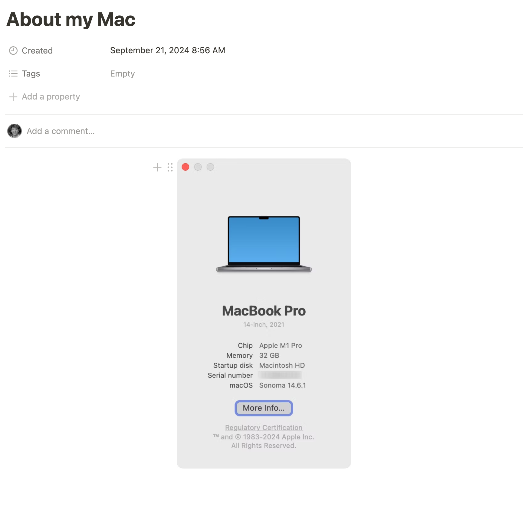 Then, please copy-paste a screenshot of the About This Mac dialog from your computer into the entry.