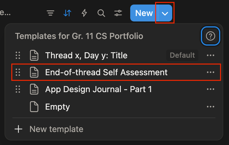 Go to Notion, click the small arrow at right beside the blue New button, then select the End-of-thread Self Assessment option.