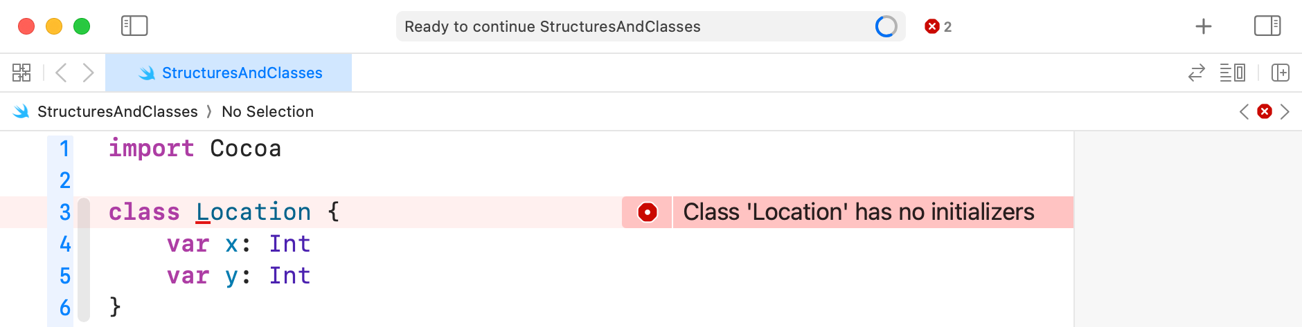 Fortunately, we do not need to write the initializer for a class manually – Xcode will do it for us. Make edits to your code as follows: