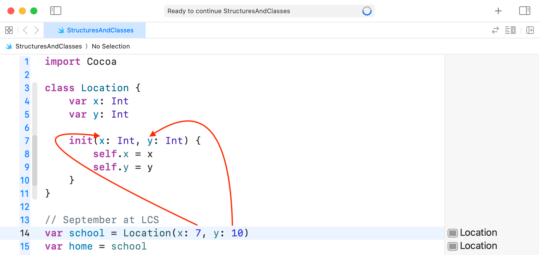 With the conversation about initializers out of the way, please run the playground with Location defined as a class: