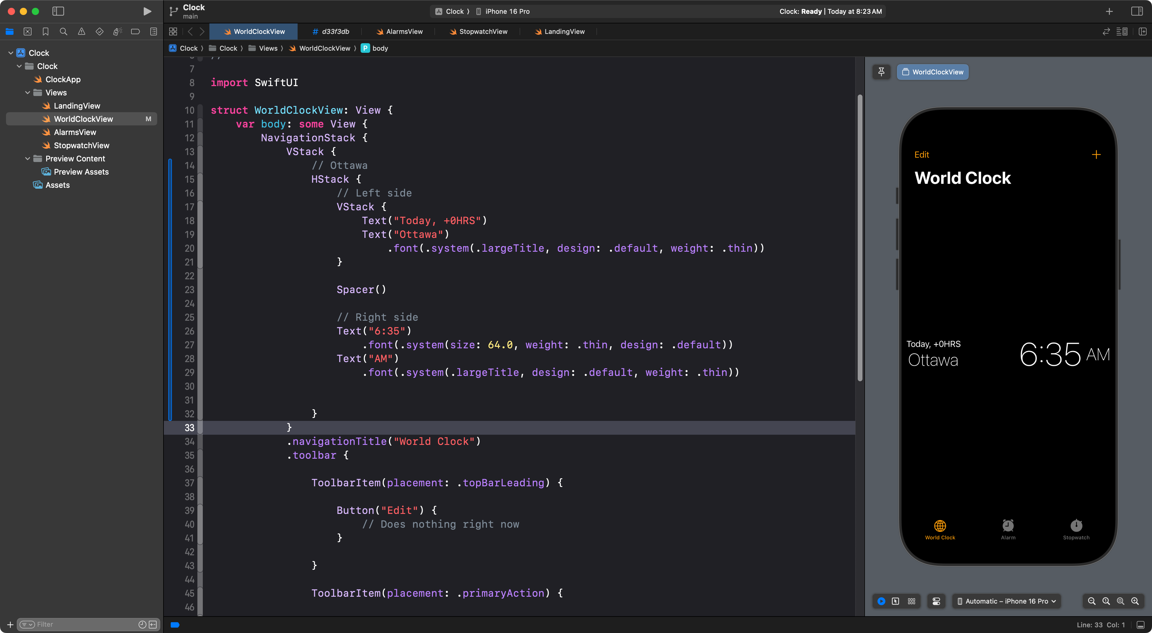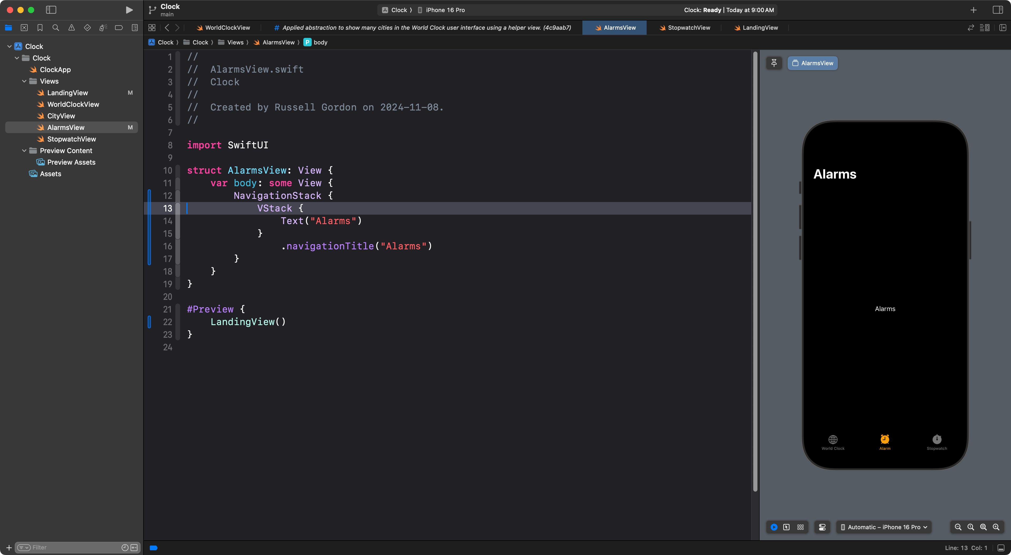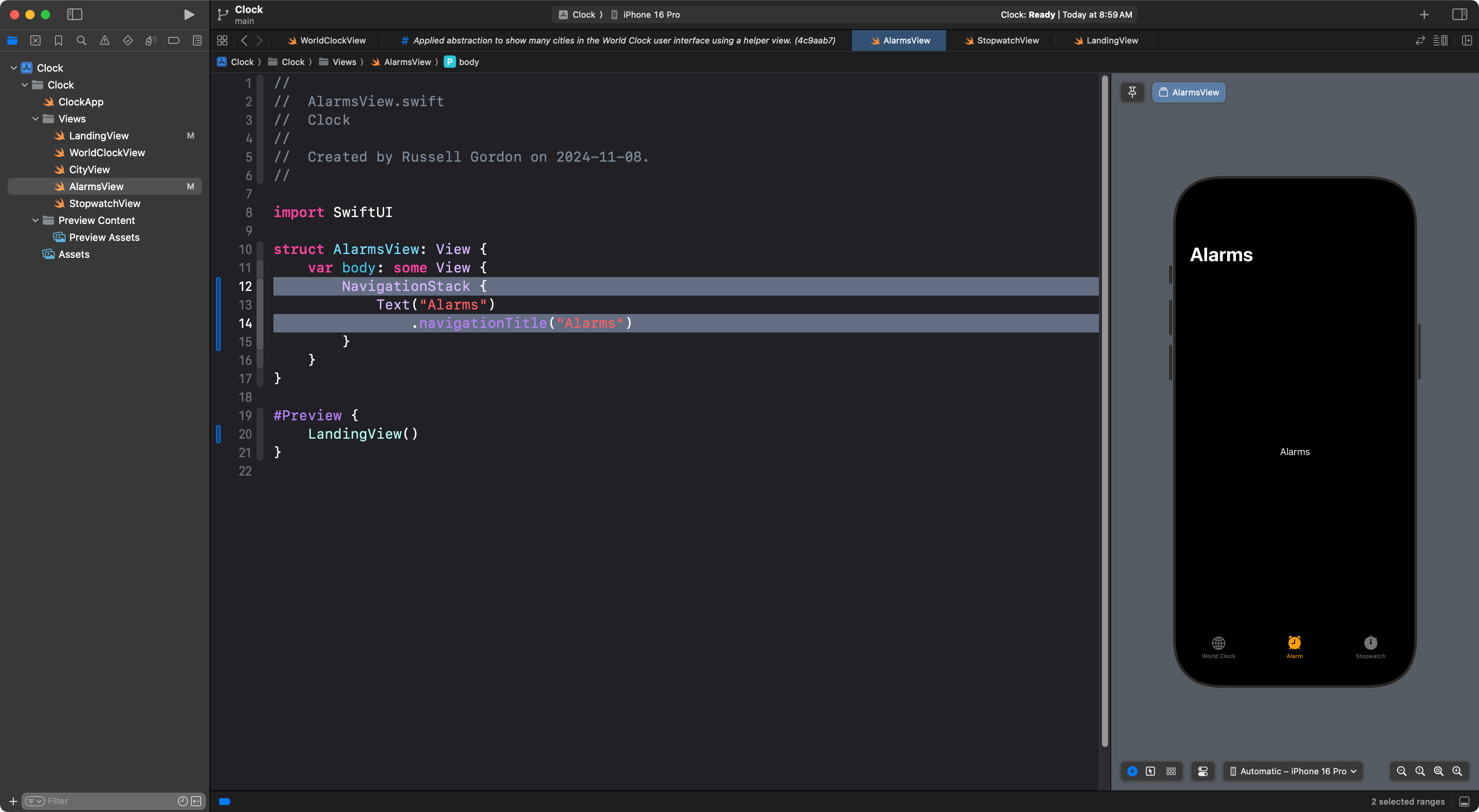 Now switch back to AlarmsView and add a navigation title like we did for WorldClockView: