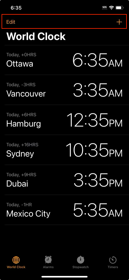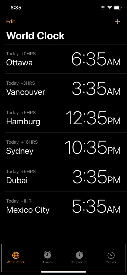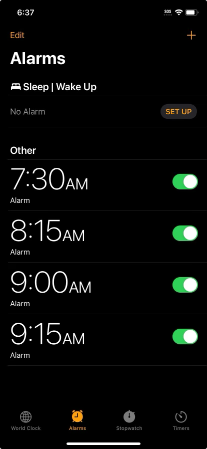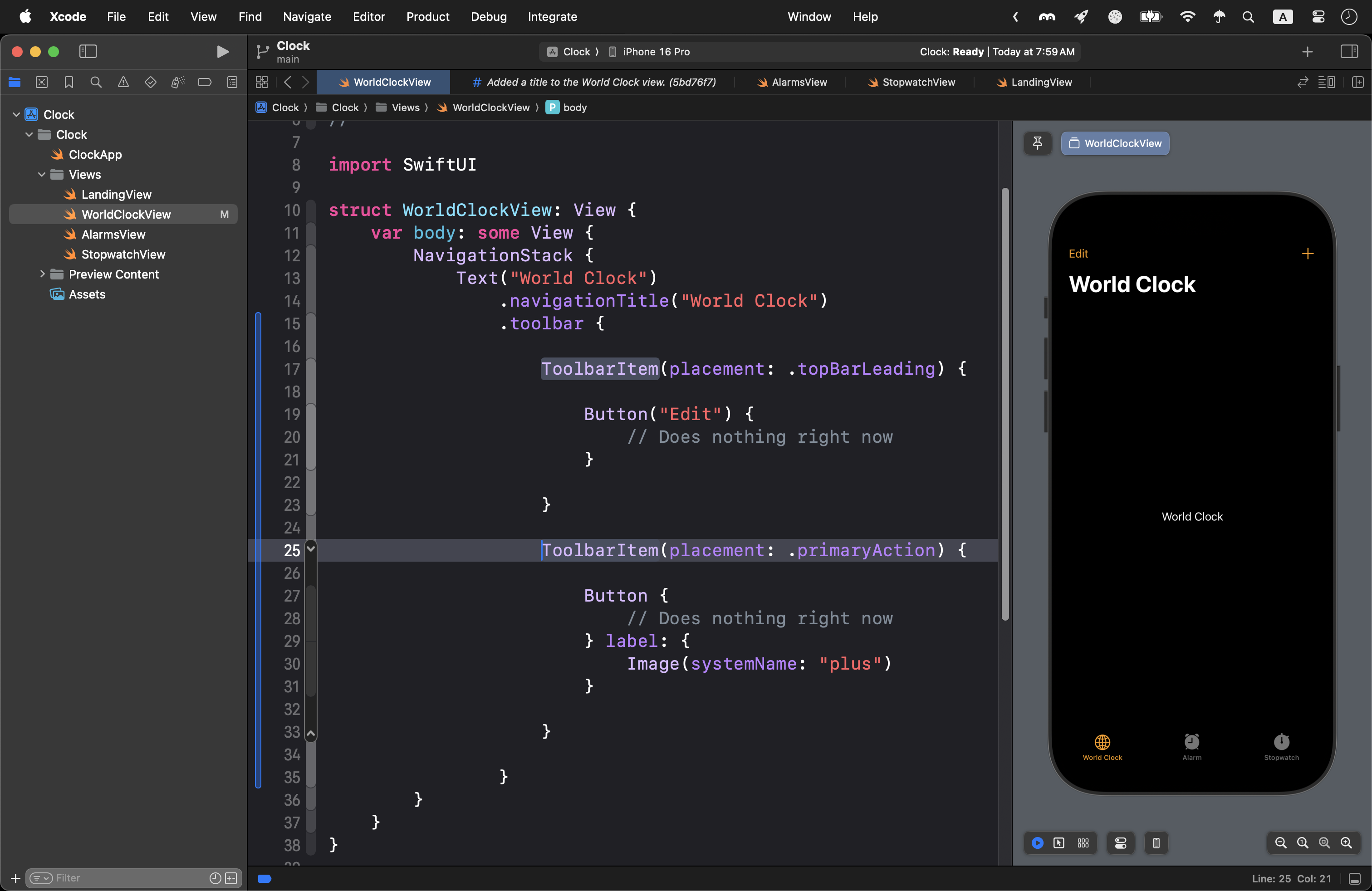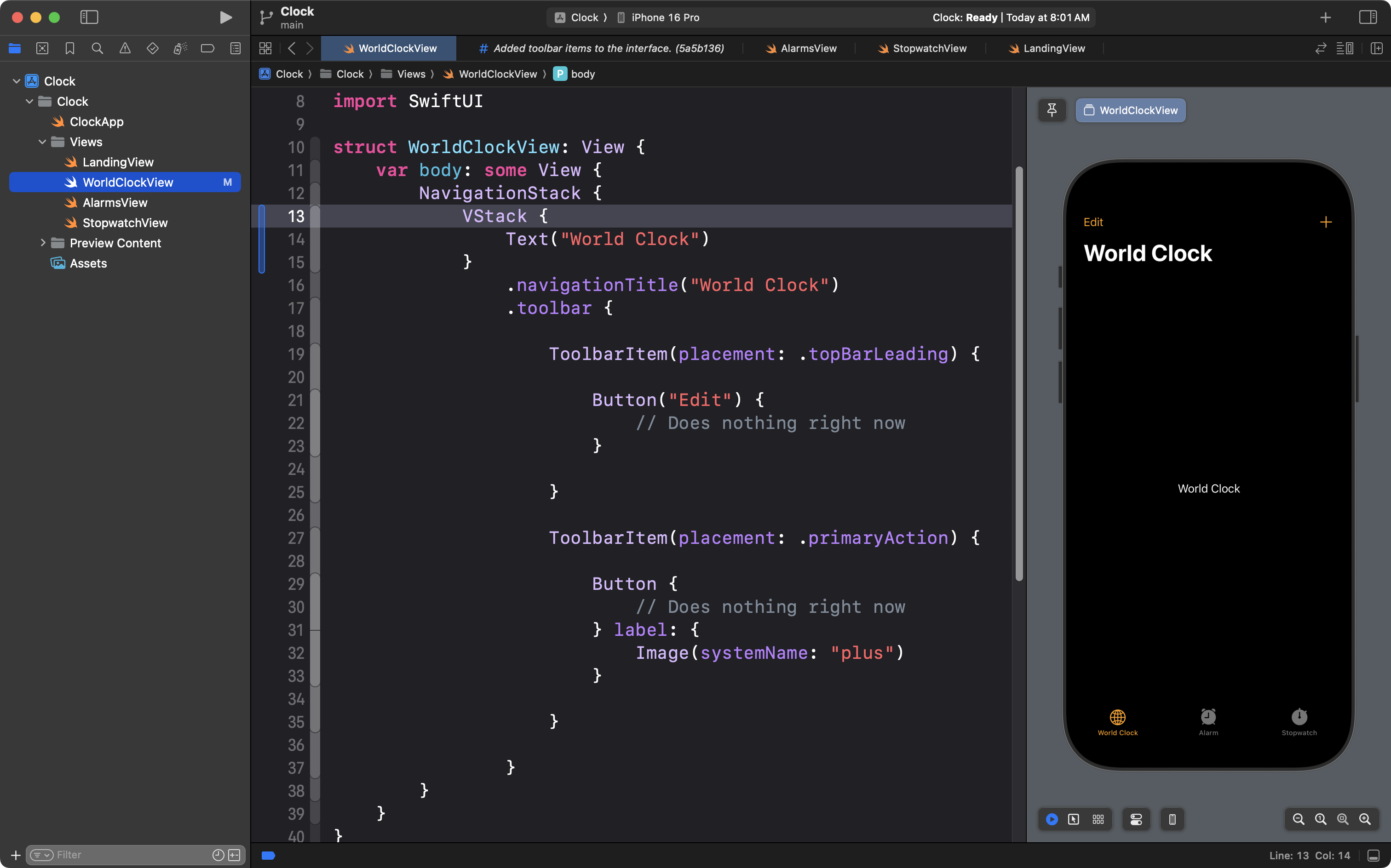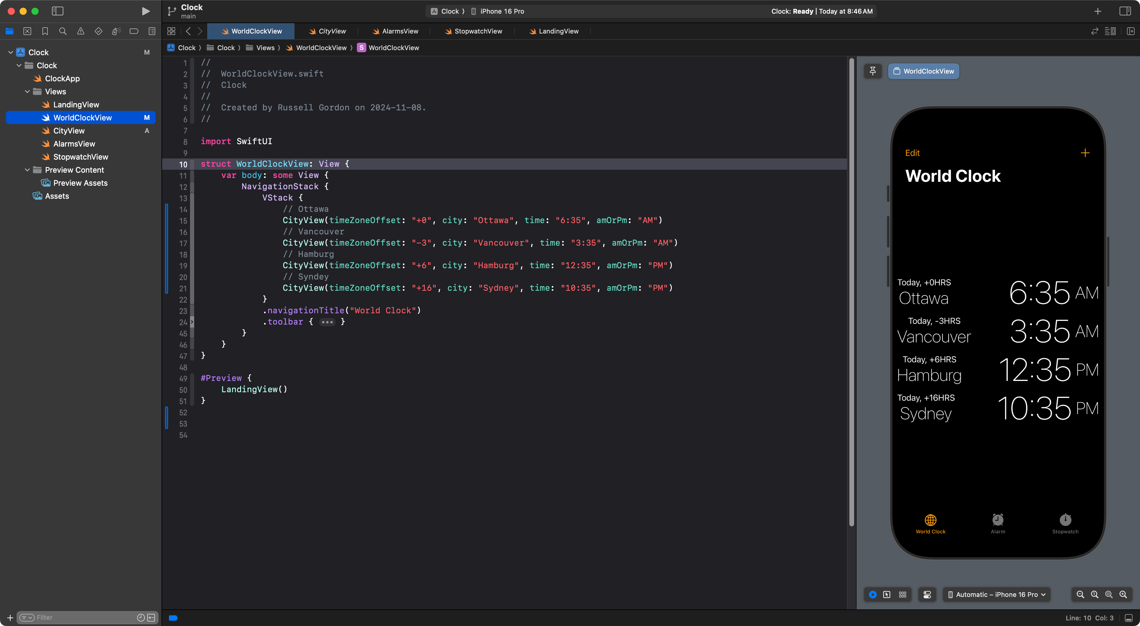 Now switch back to AlarmsView and add a navigation title like we did for WorldClockView: