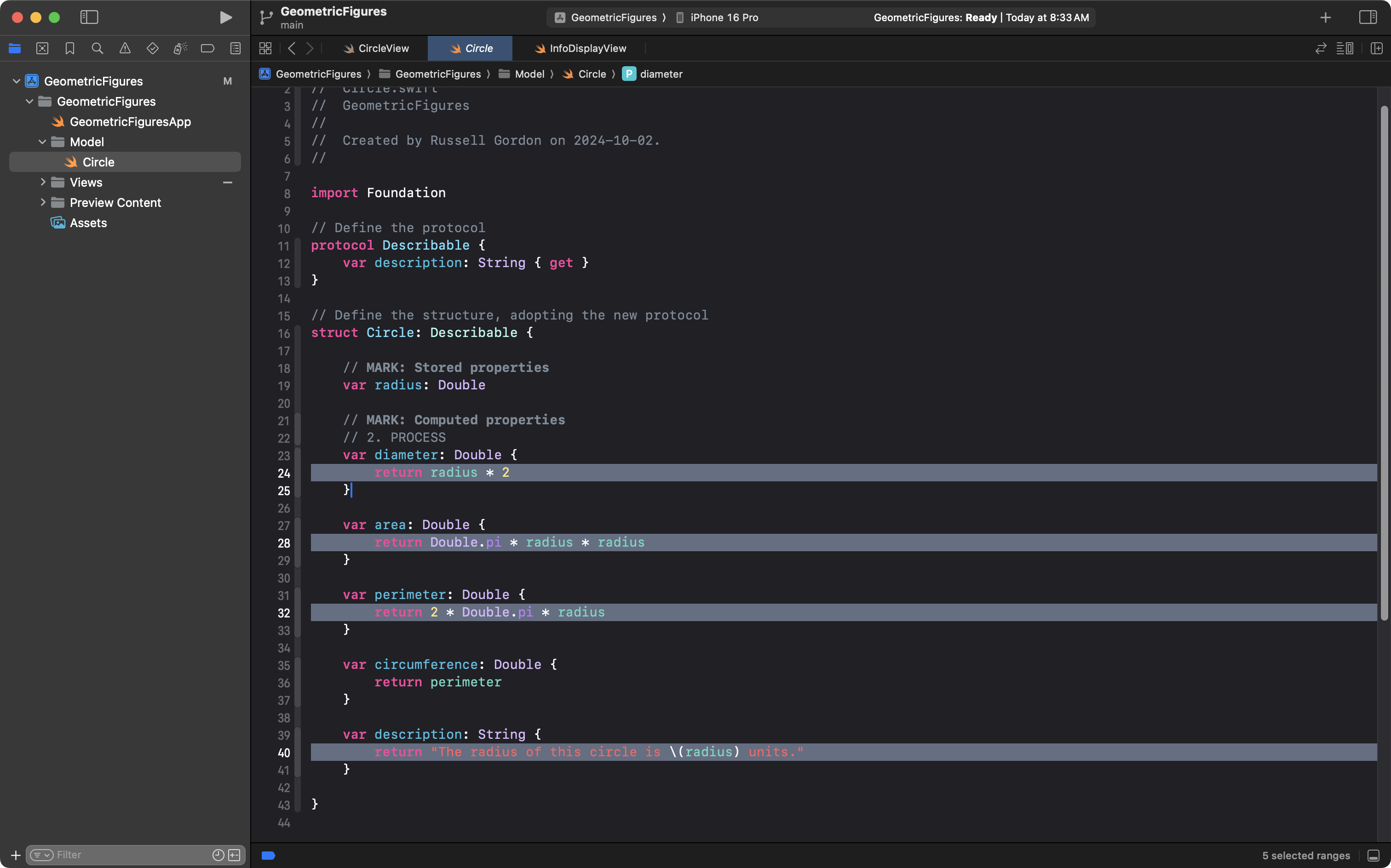radiusstored property is used to calculate values for thediameter,area,perimeter, anddescriptioncomputed properties.