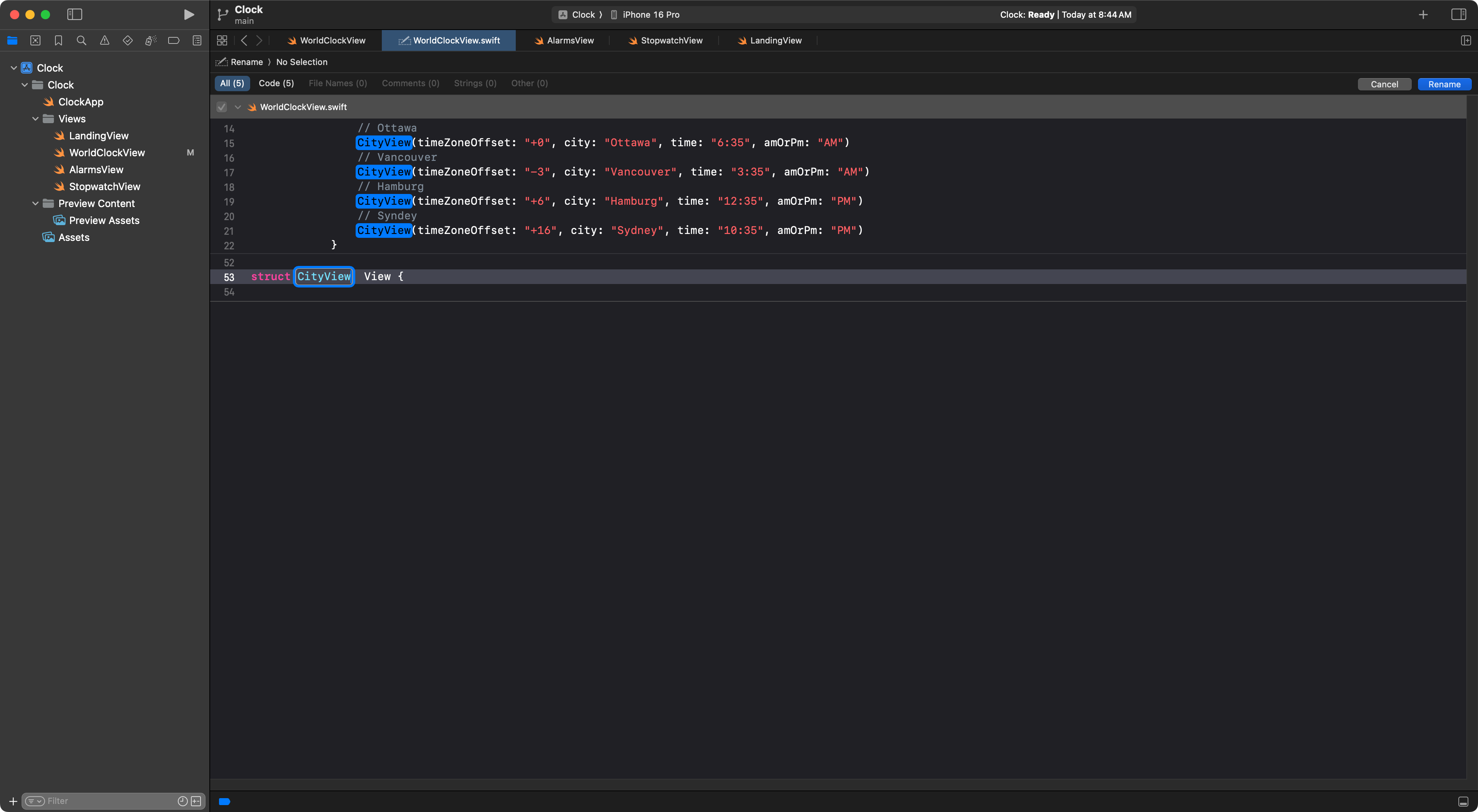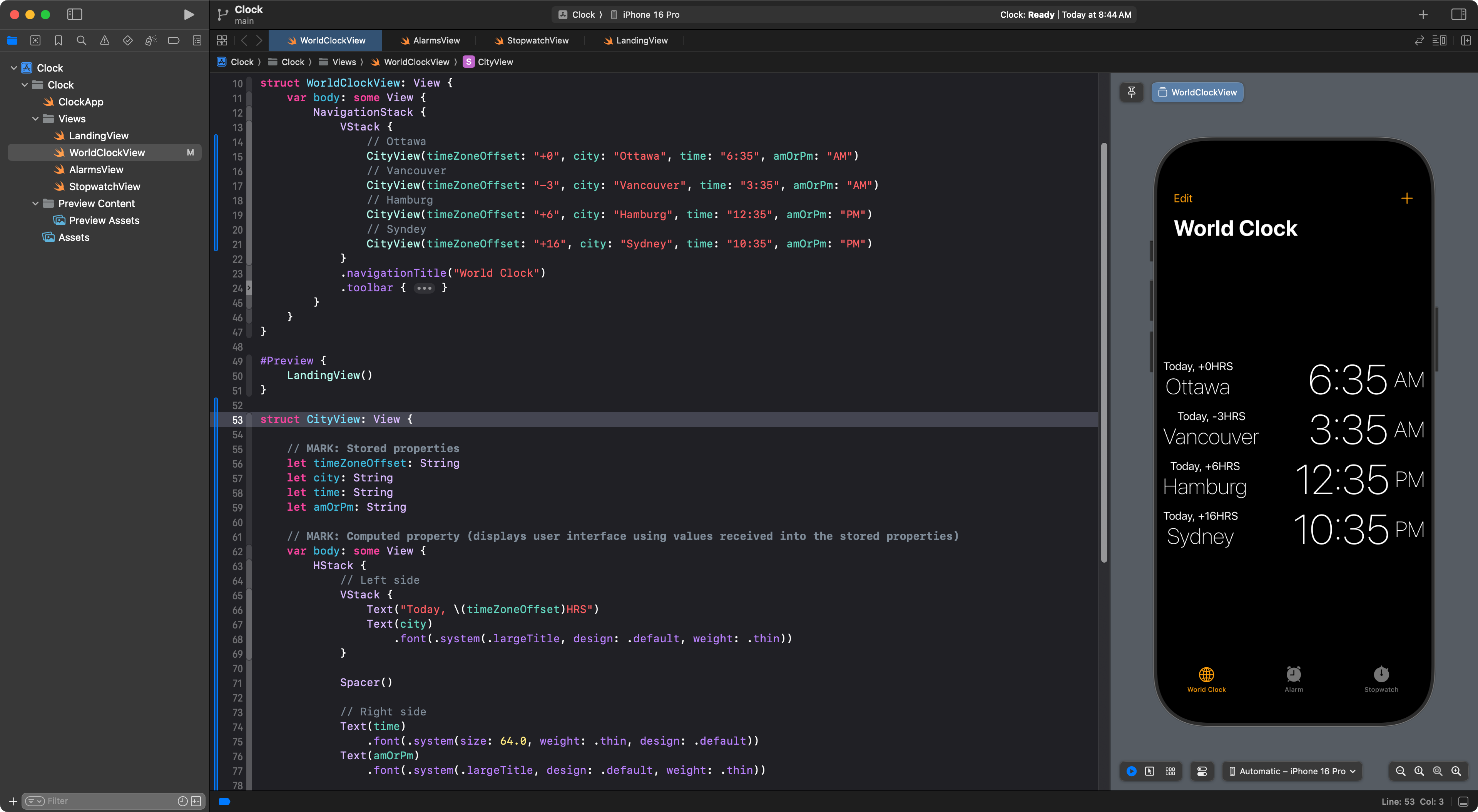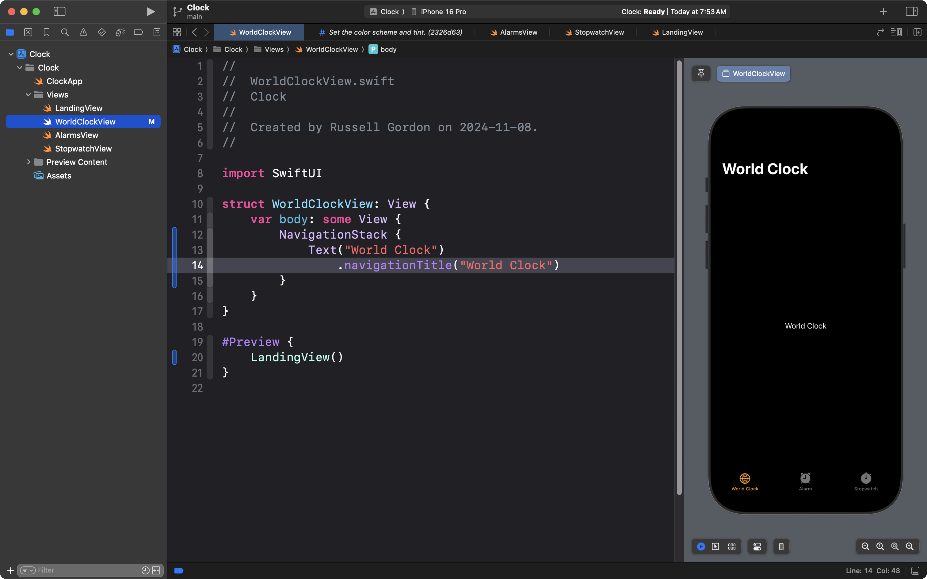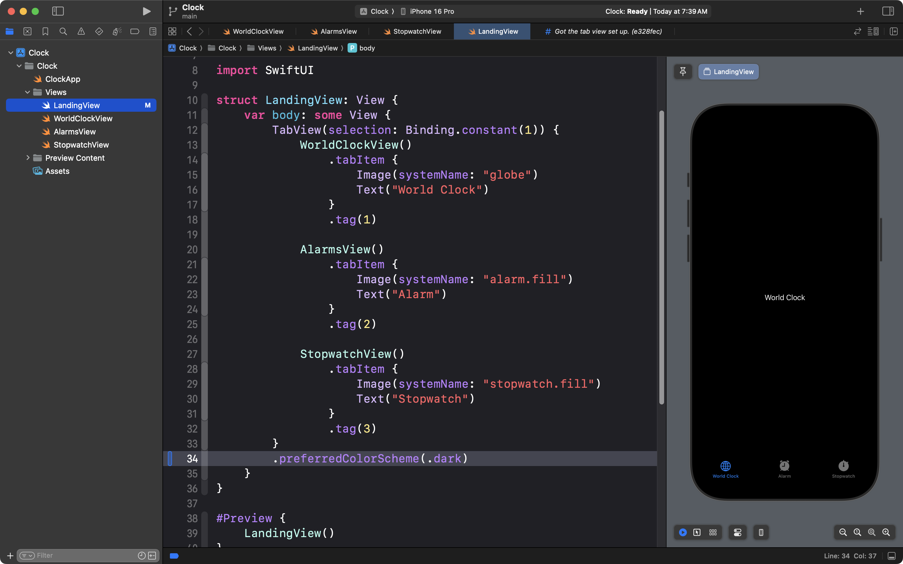 If you don’t see the WorldClockView, go back to LandingView, and make sure that on line 12, the value for the selection on the tab view is set to