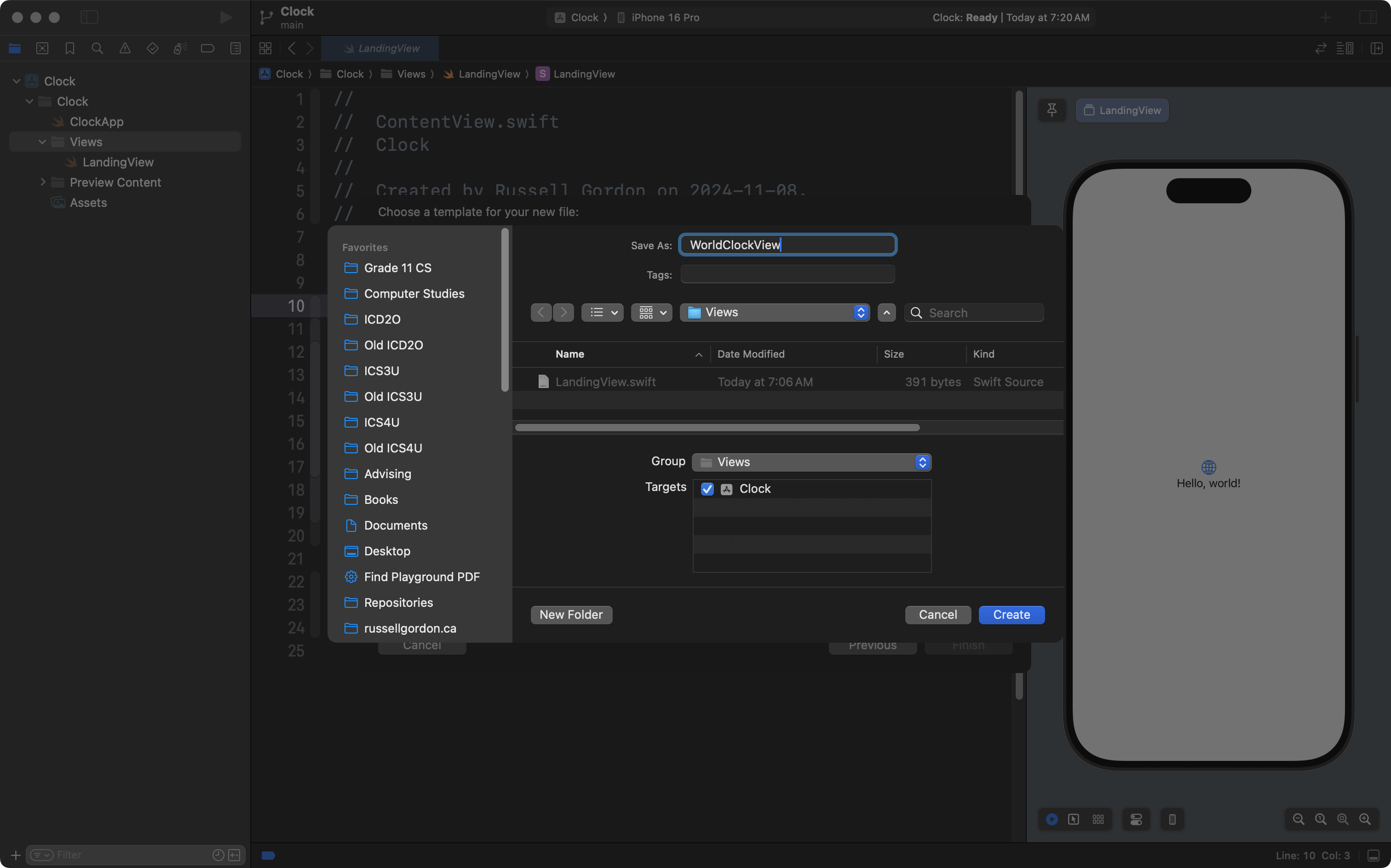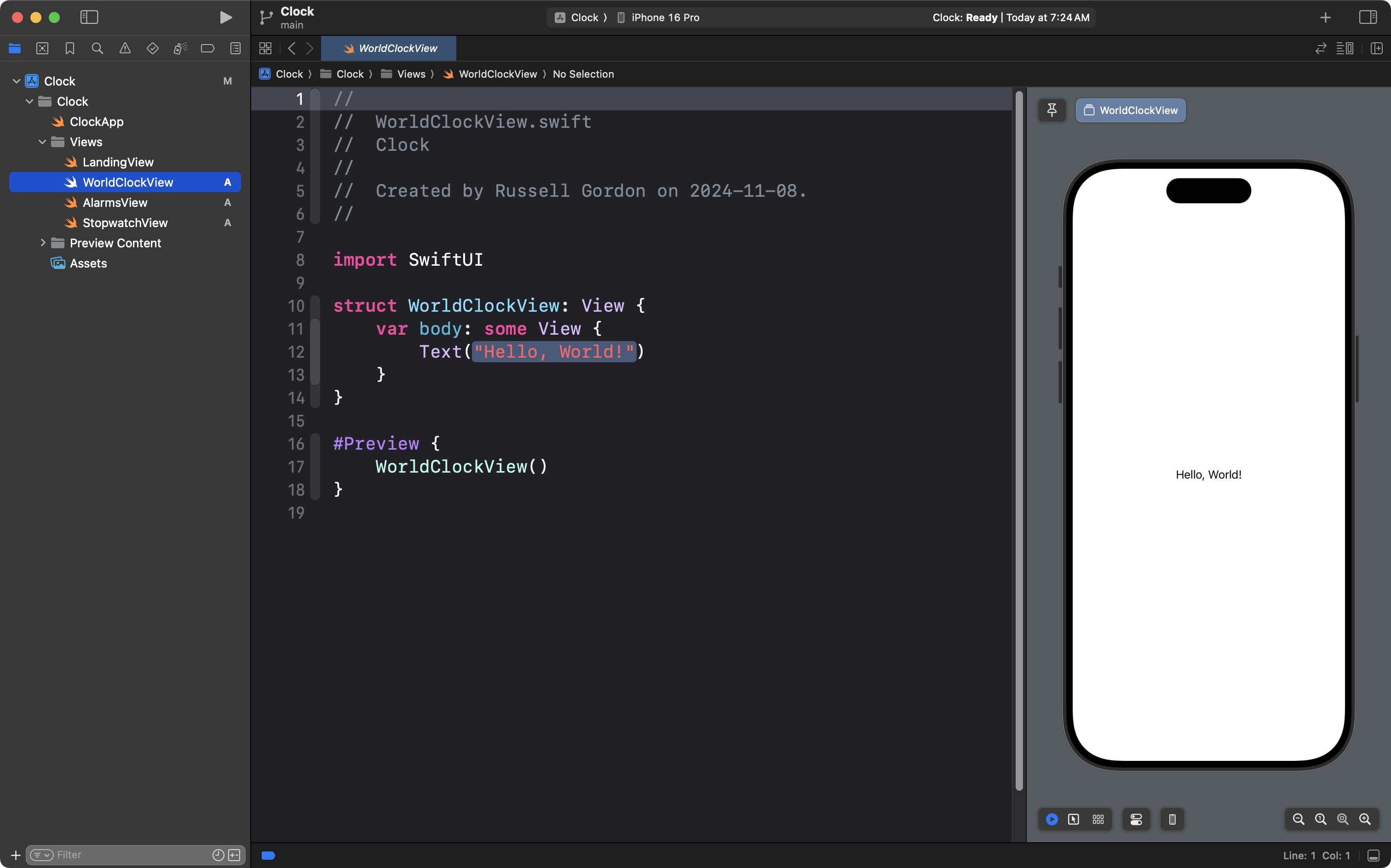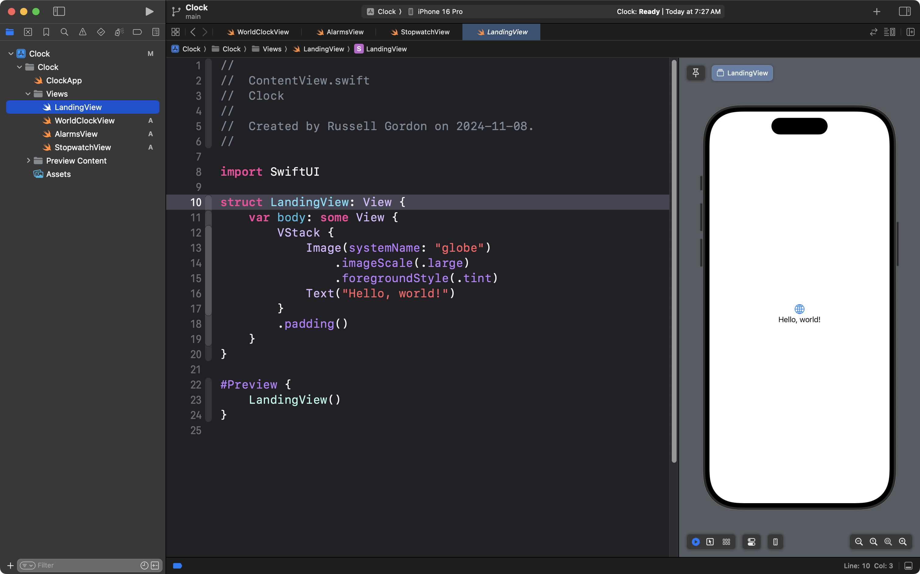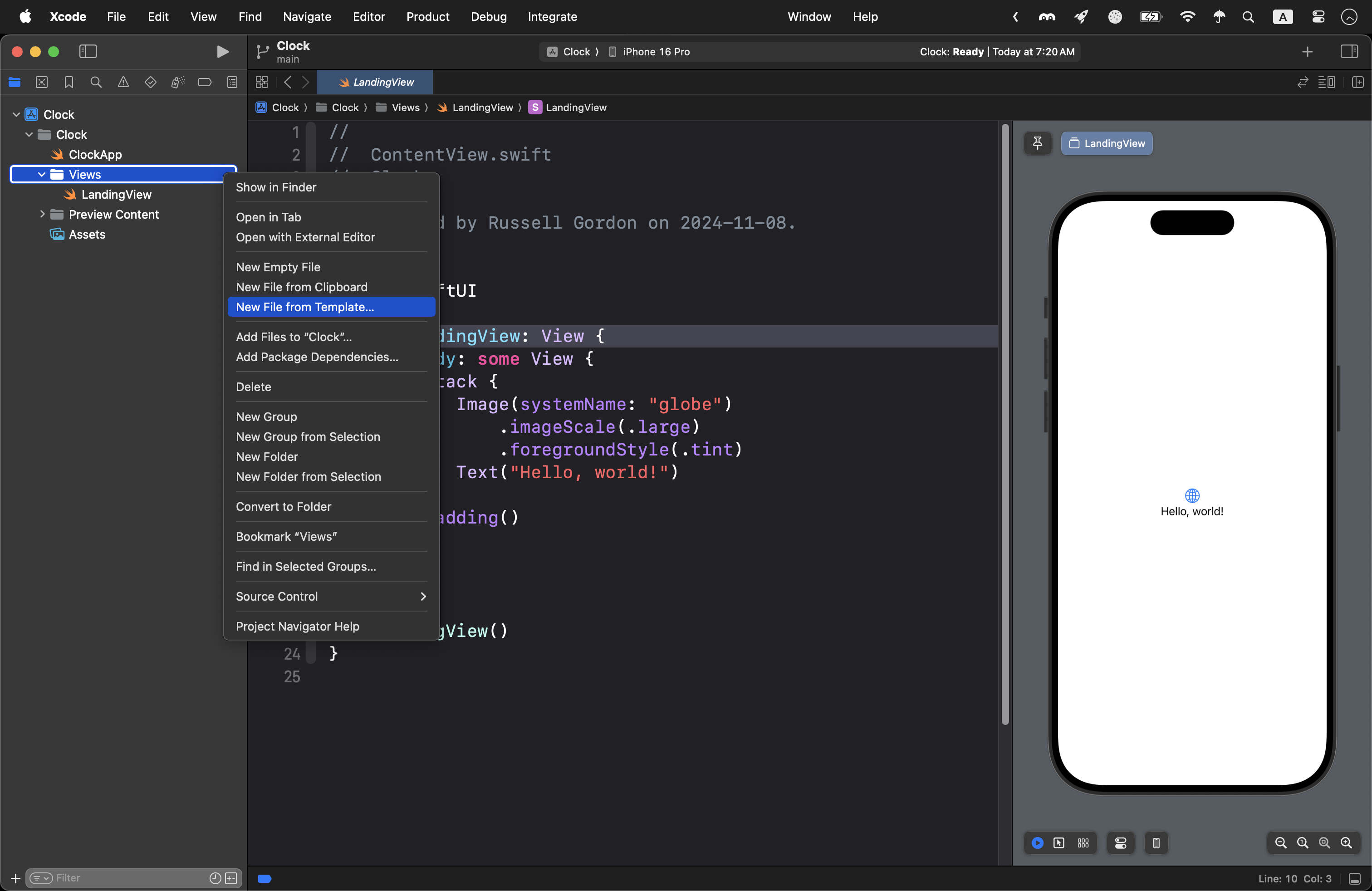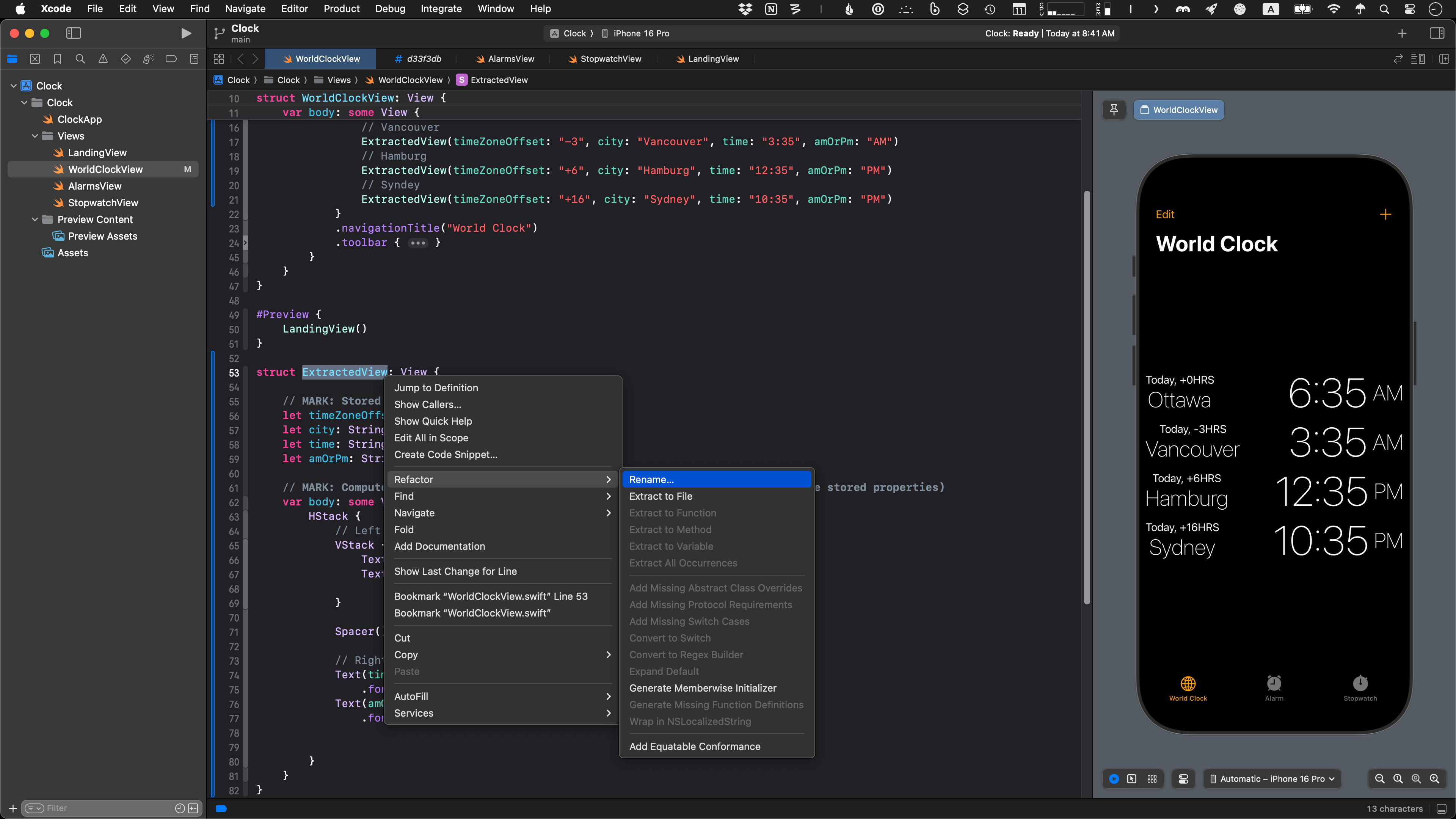 If you don’t see the WorldClockView, go back to LandingView, and make sure that on line 12, the value for the selection on the tab view is set to