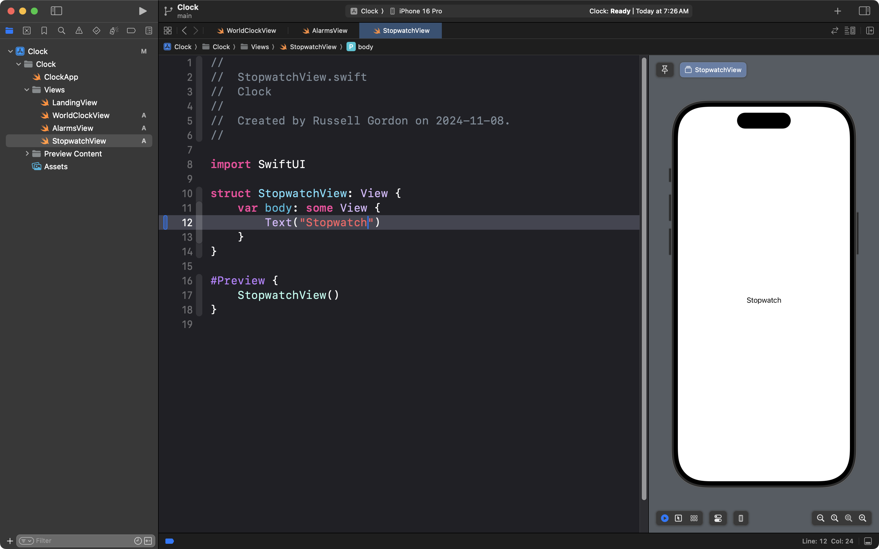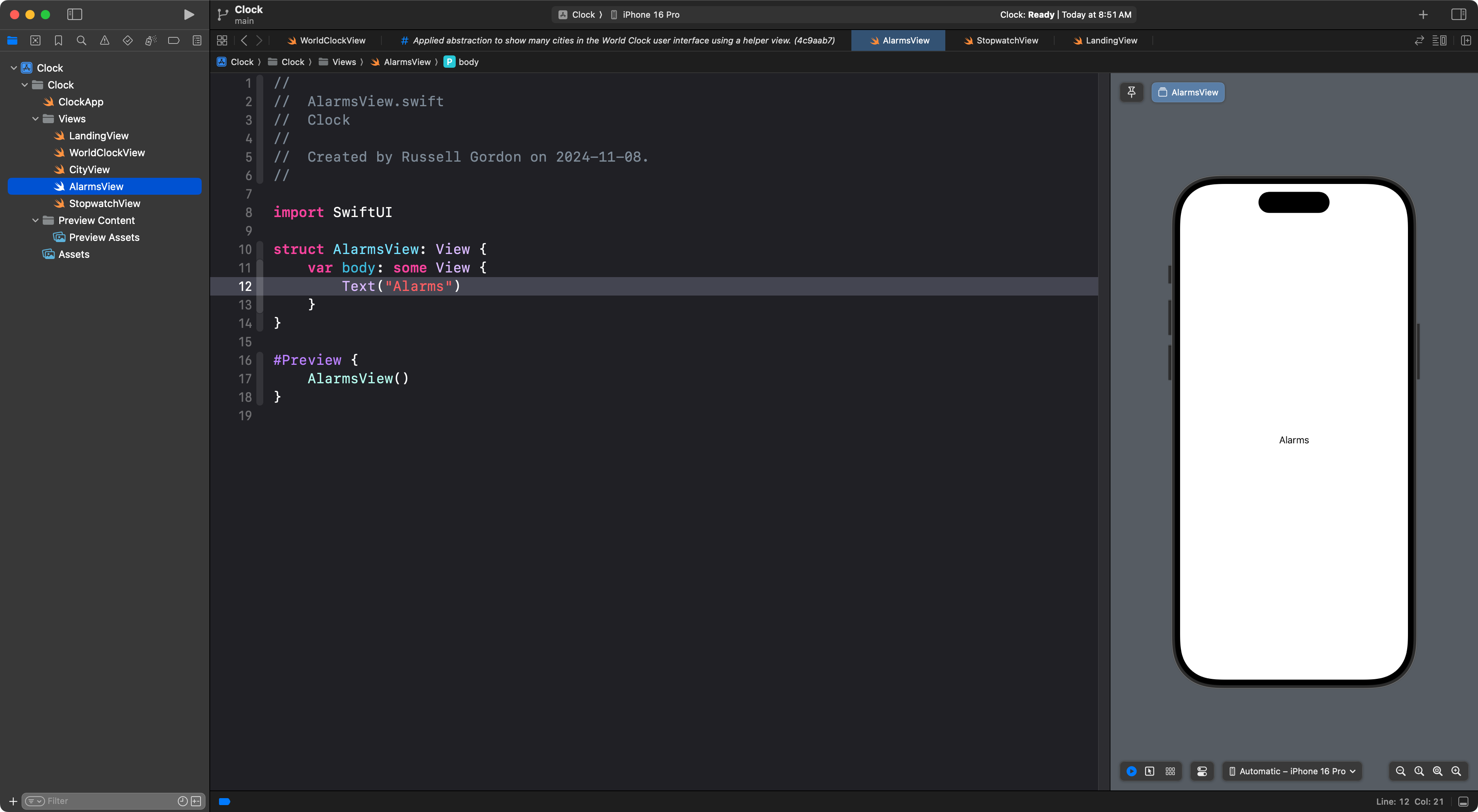 Again, follow these same steps to create the next two views – AlarmsView and StopwatchView.