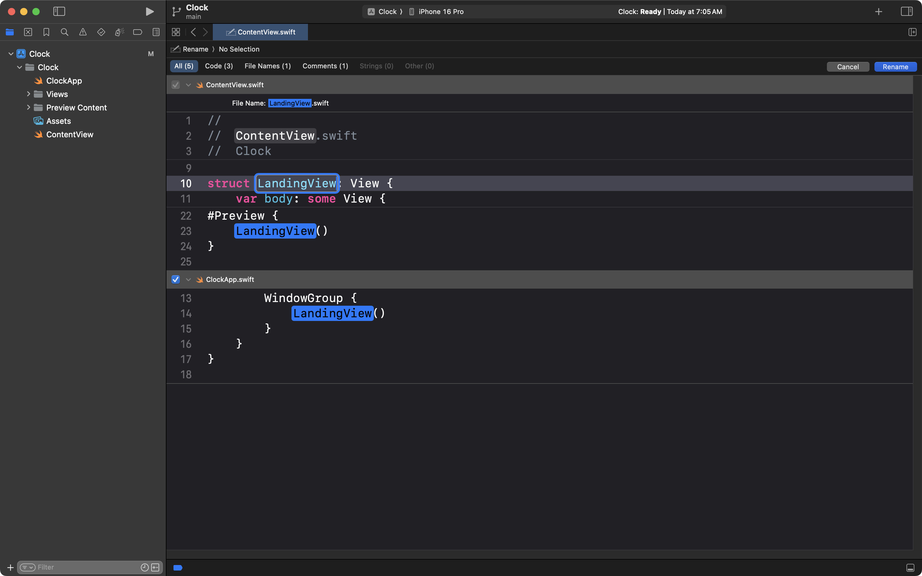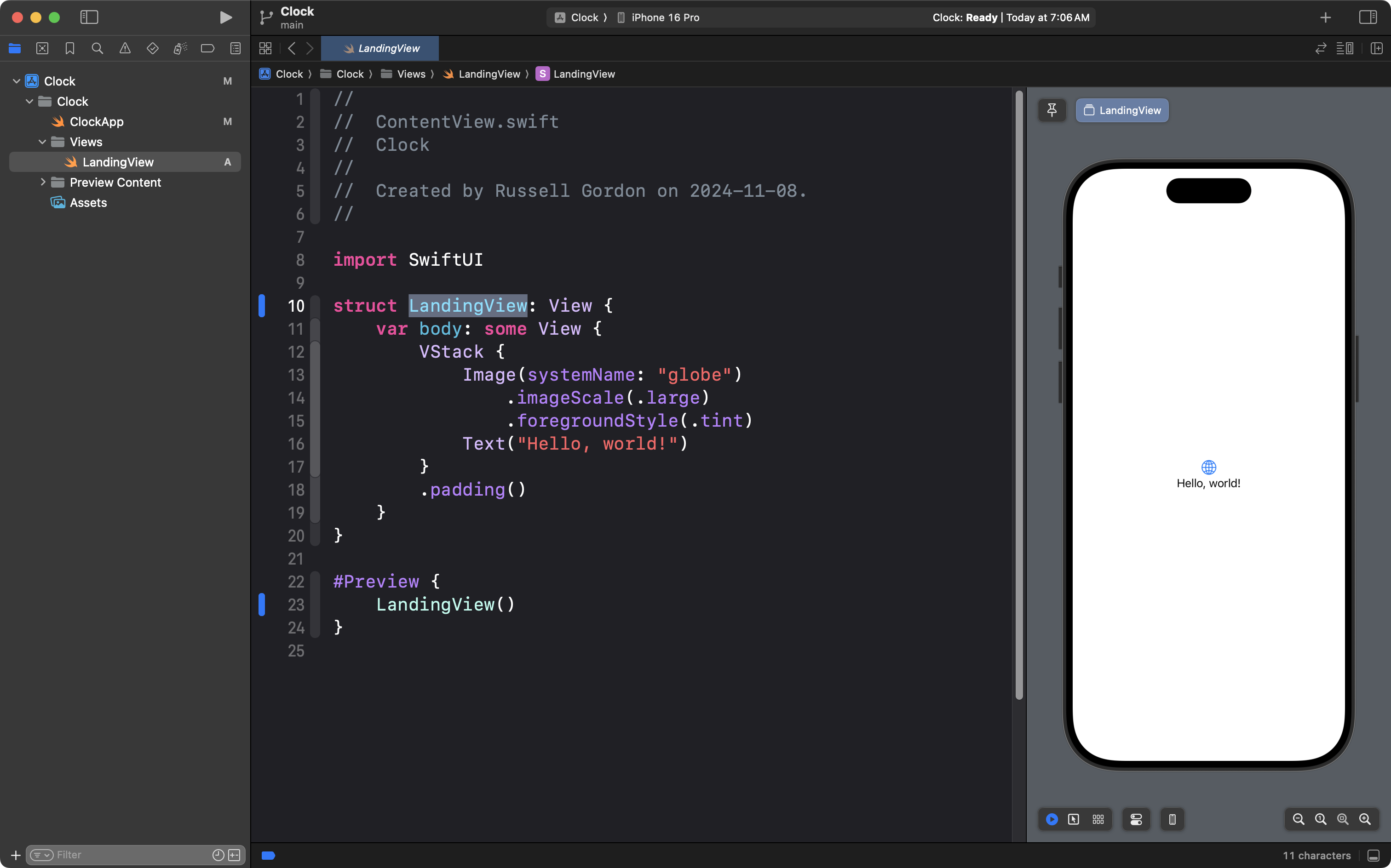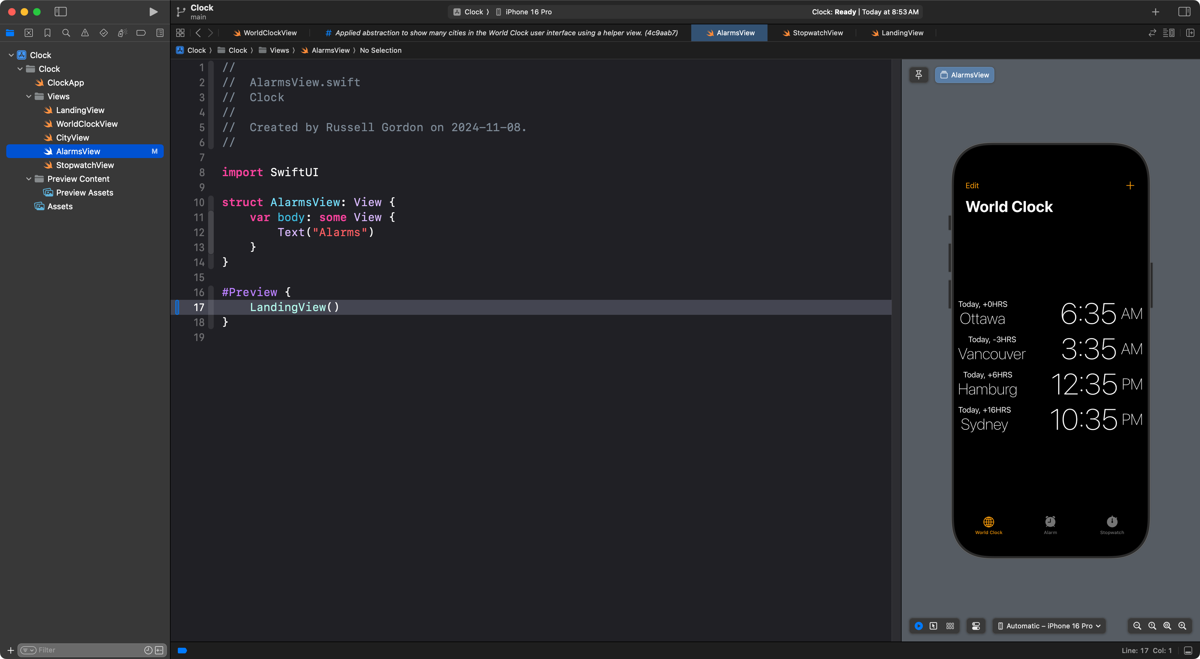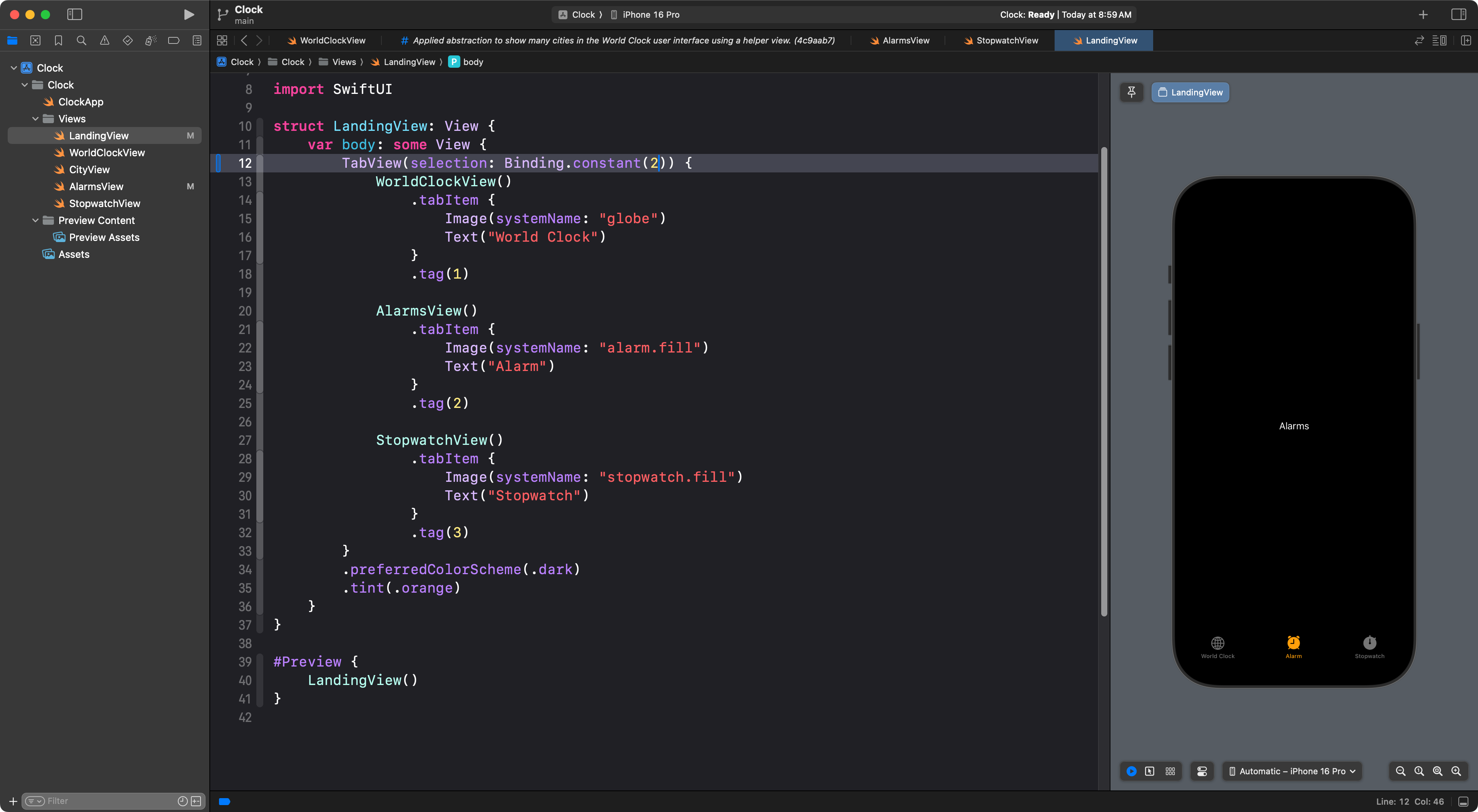 Of course, you will want to see the tab view. So, as we did before for the WorldClockView, change what is shown by the preview so that it shows the LandingView instead:
