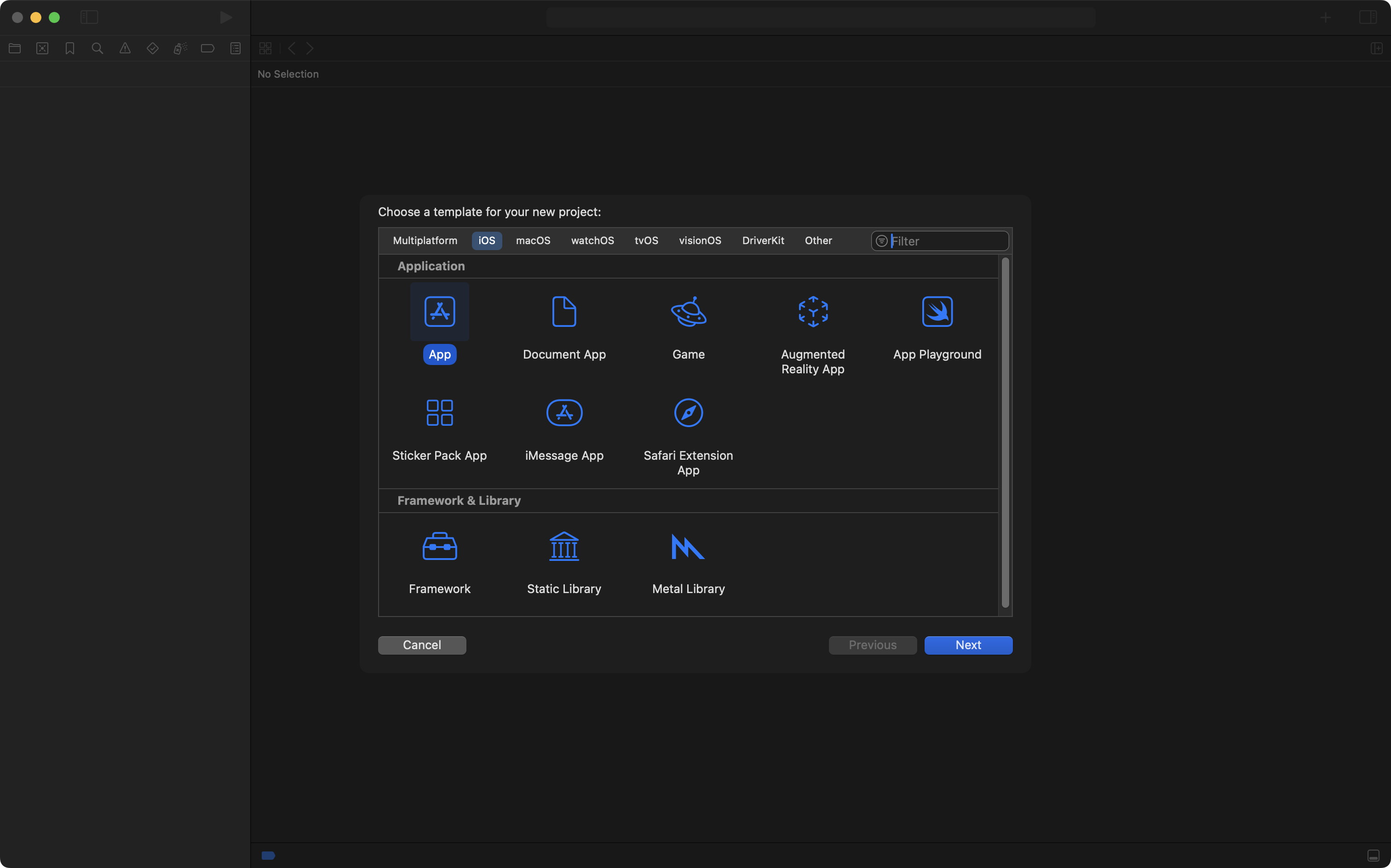 In Xcode, from the menus, choose File > New > Project… then select the iOS tab and then App, and finally press the Next button:
