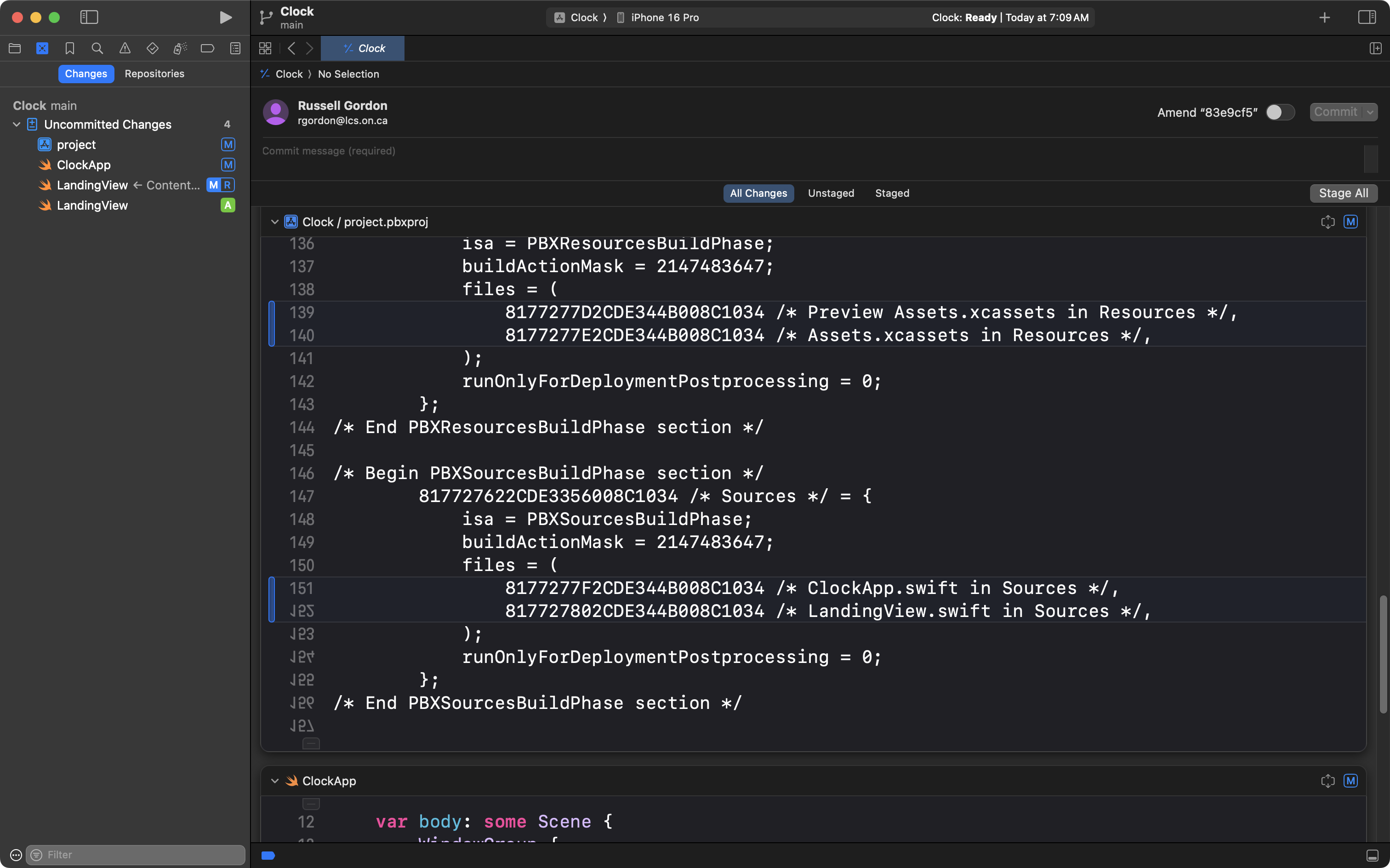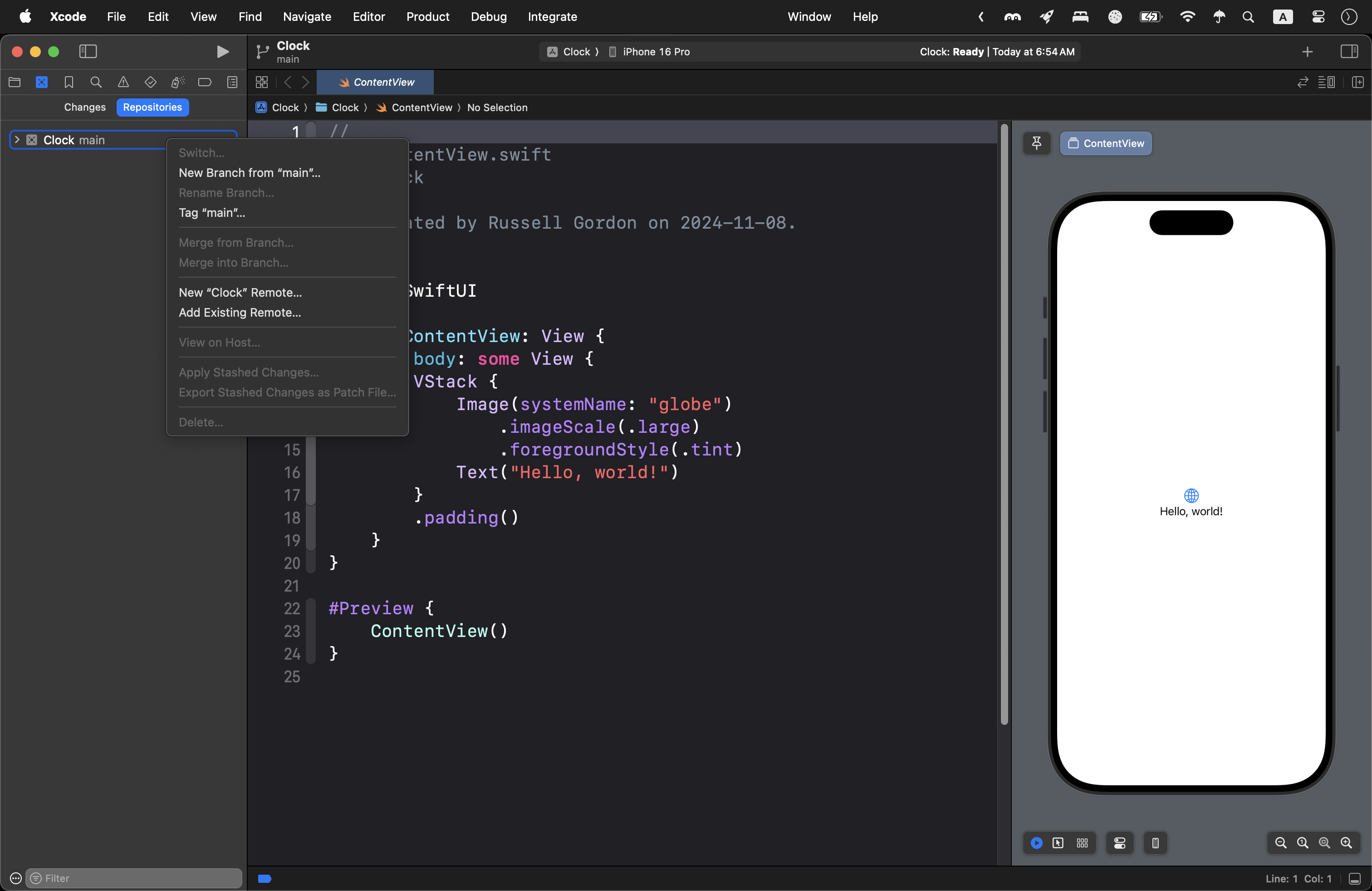 Once you have a single row showing the World Clock interface, this is a good time to commit and push your work. Do that now, using the Option-Command-C keyboard shortcut, using this message: