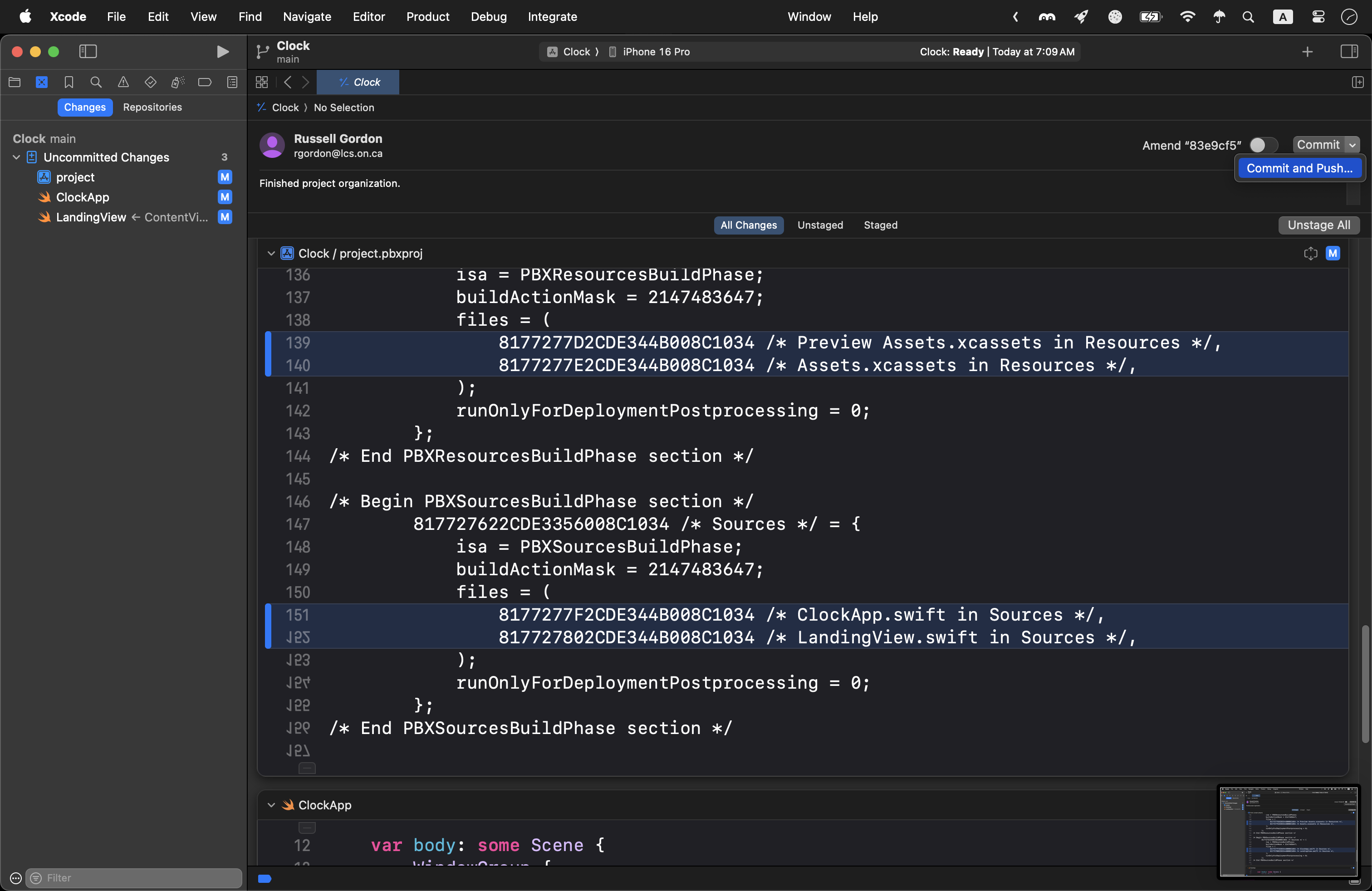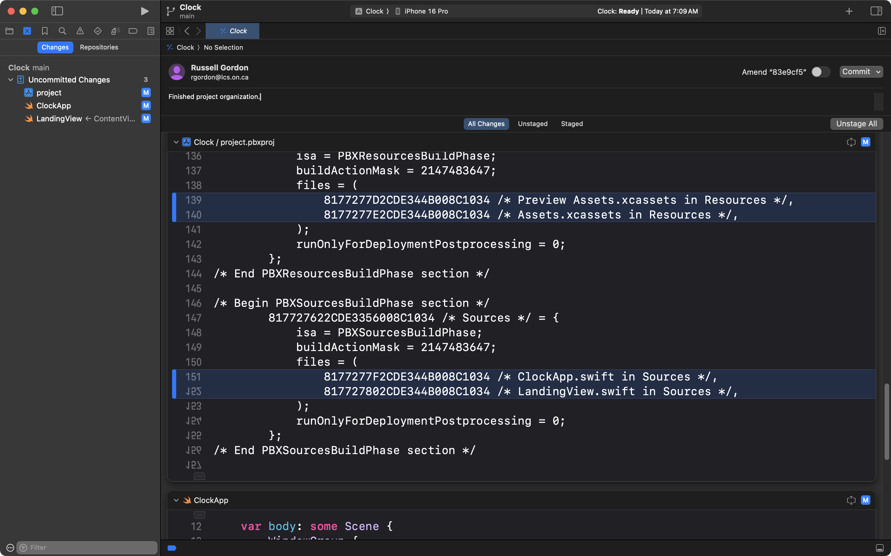 After completing this organization, now is a good time to commit your work. Use the Option-Command-C keyboard shortcut and you will see the interface that shows you recent changes: