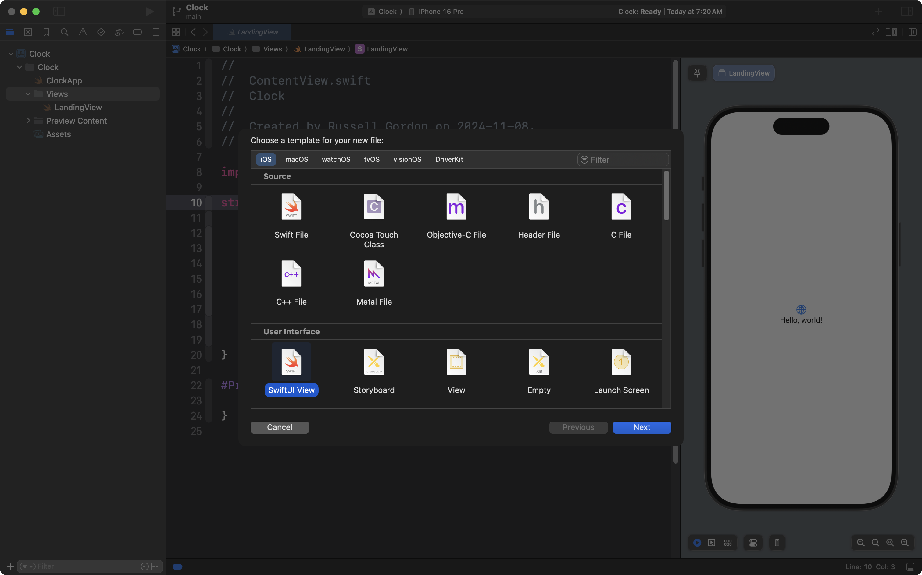 Return to the Project navigator by pressing Command-1, then select the LandingView file: