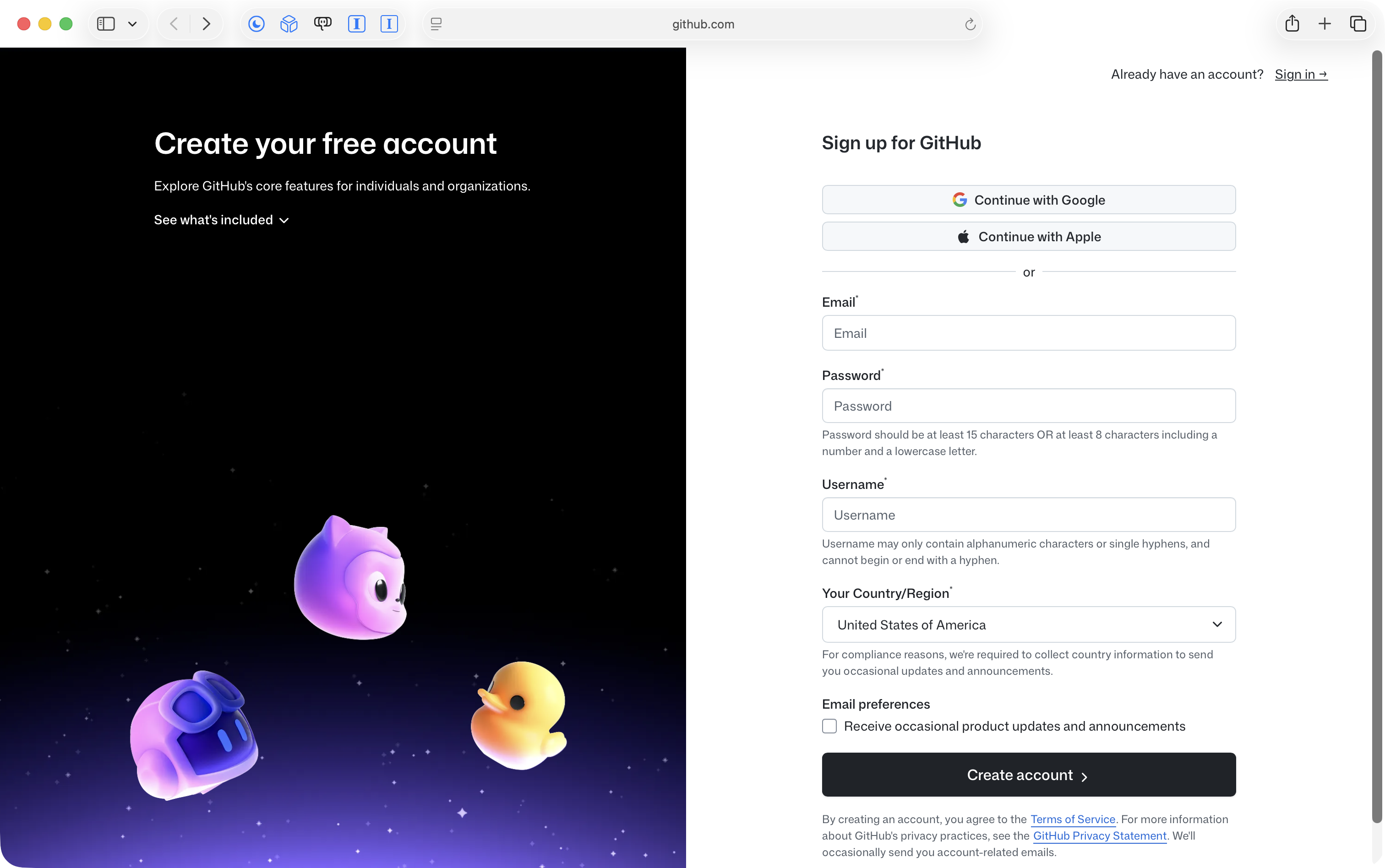 The user interface of the GitHub signup flow tends to change fairly often. It may look a little bit different than what is pictured here, but the key steps to follow are described below.