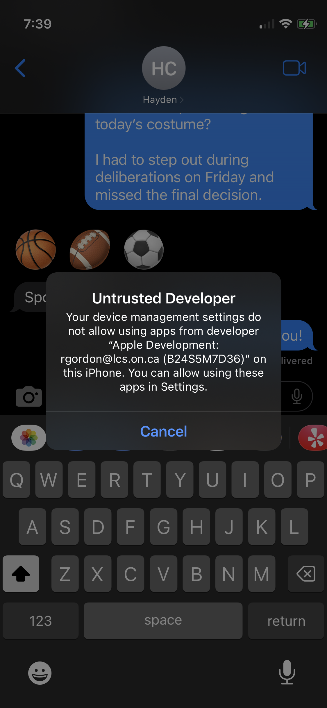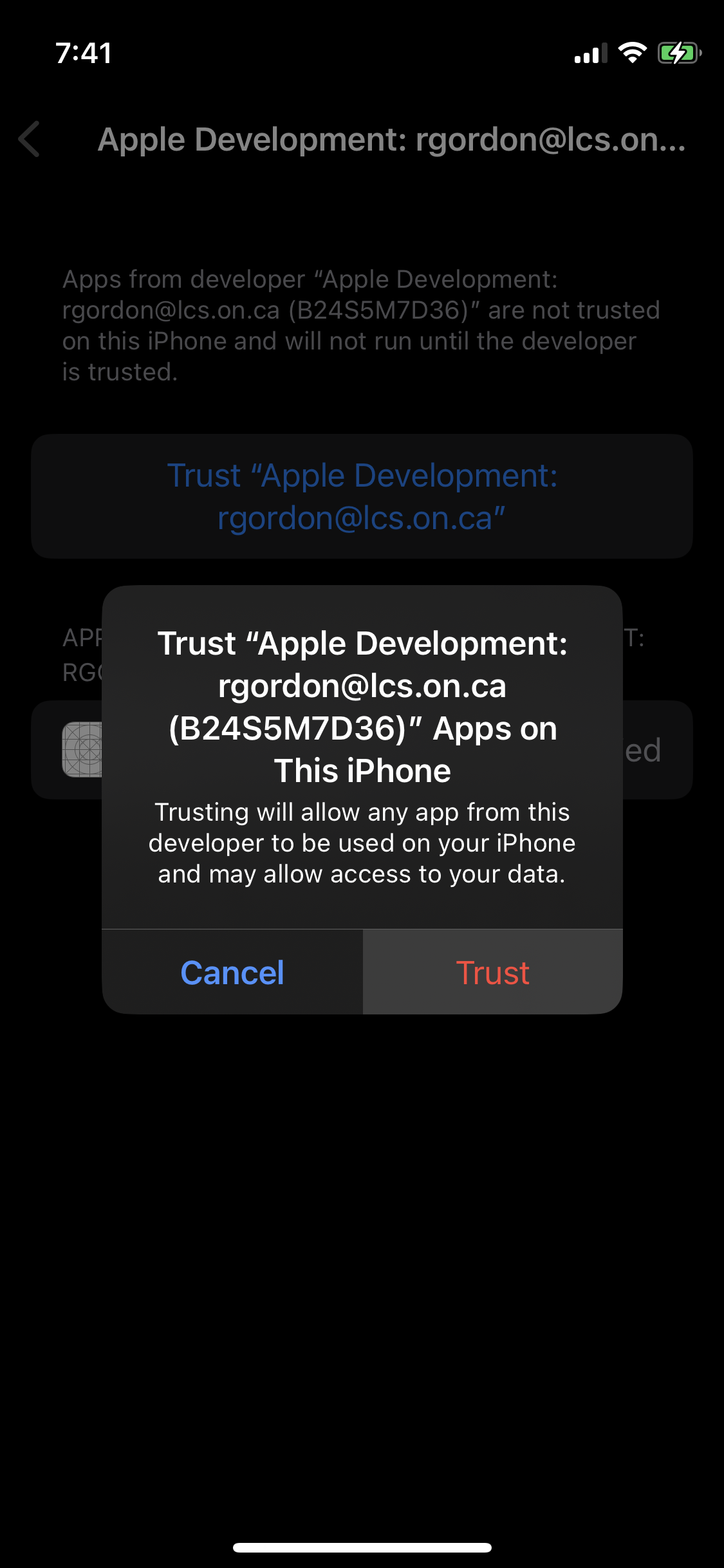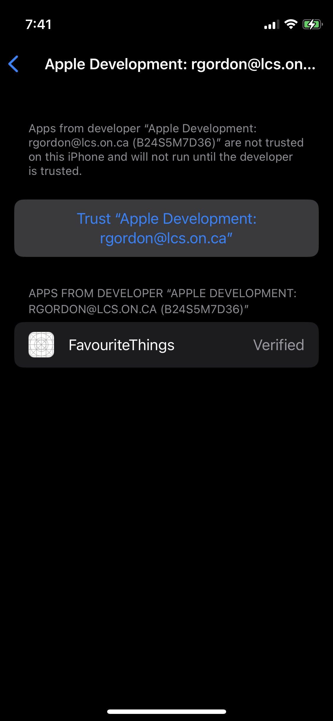 You must have a valid Apple Developer Program (ADP) membership to load an app onto your phone. You will have previously accepted the invitation Mr. Gordon sent you for the ADP. Recall that your ADP membership is tied to the Apple ID you created using your LCS email address.