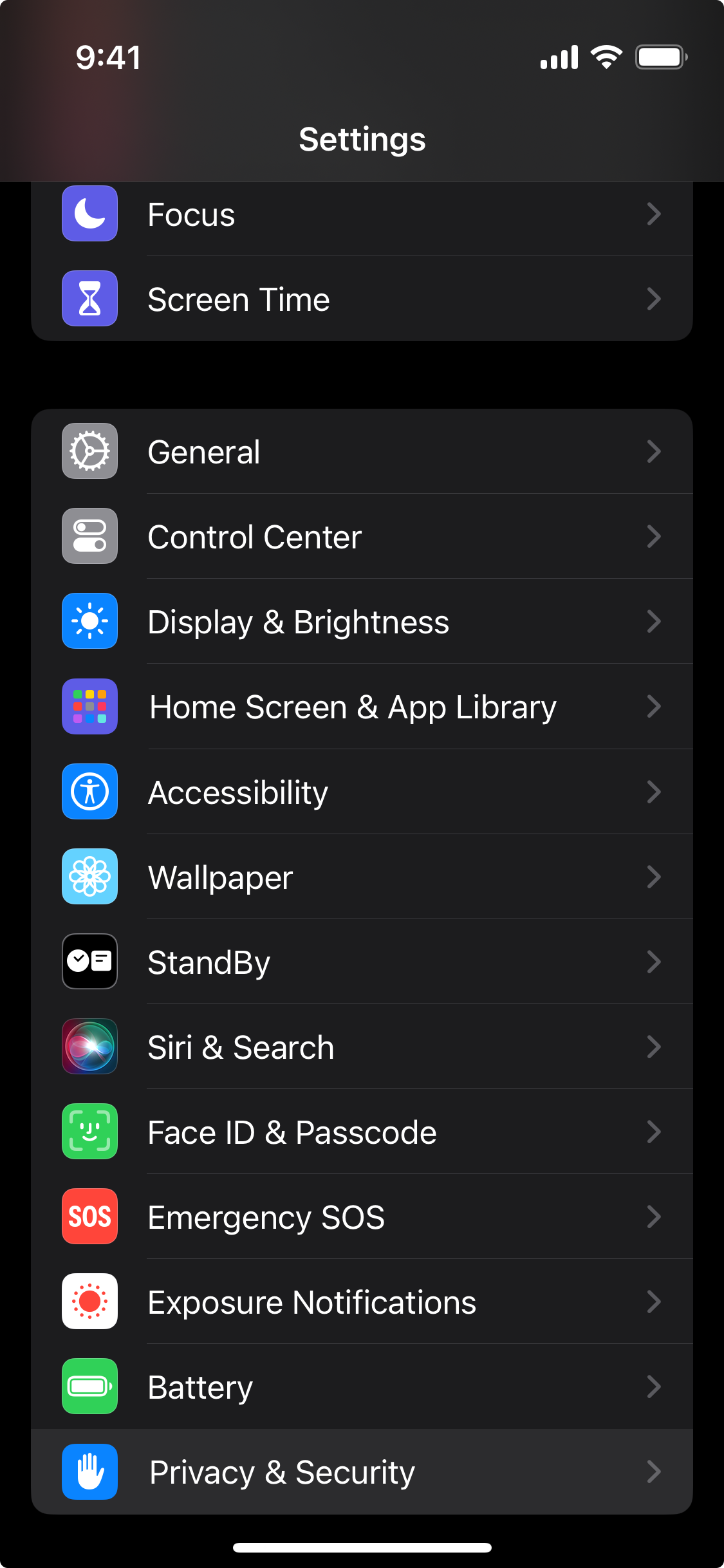 To do this, first open the Settings app, then select Privacy & Security: