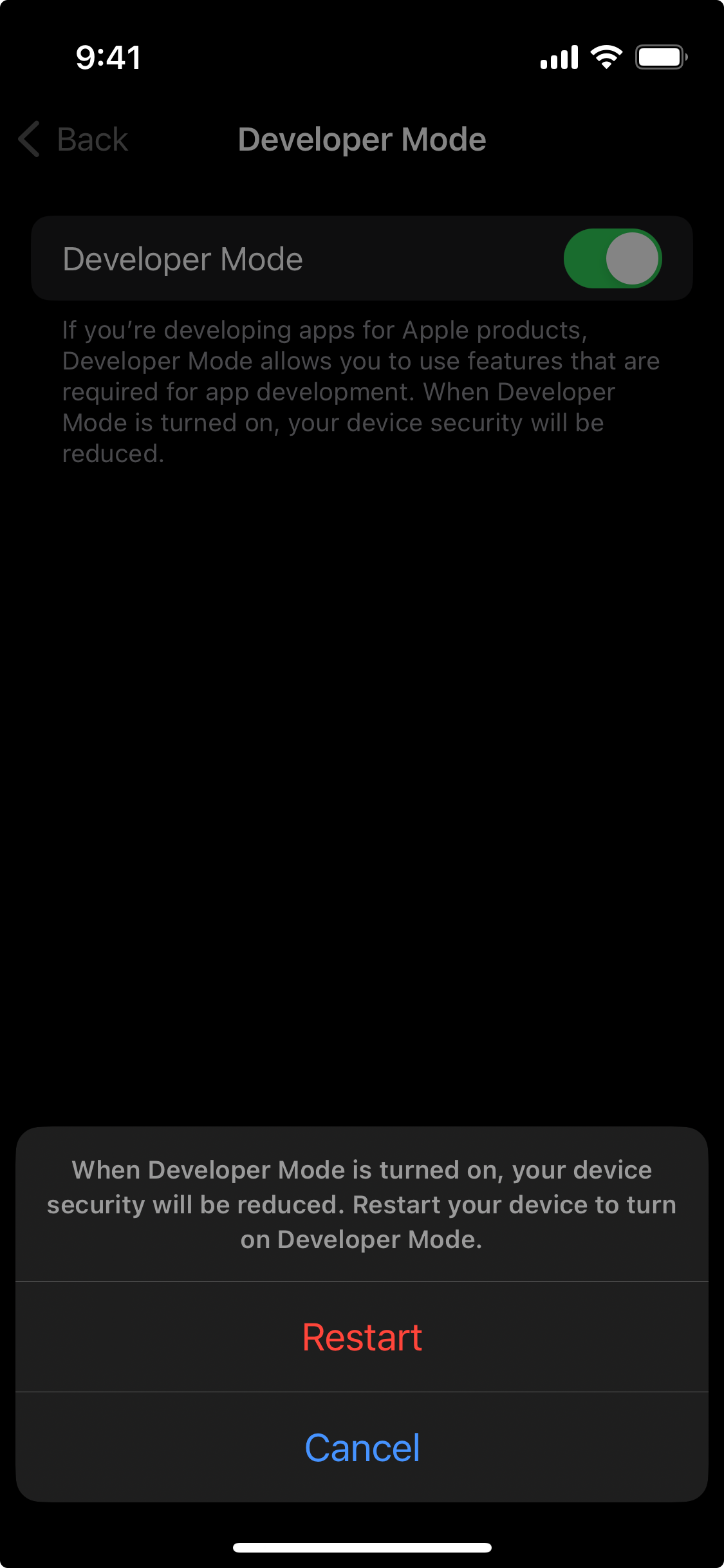 Turn on Developer Mode, then restart your iPhone: