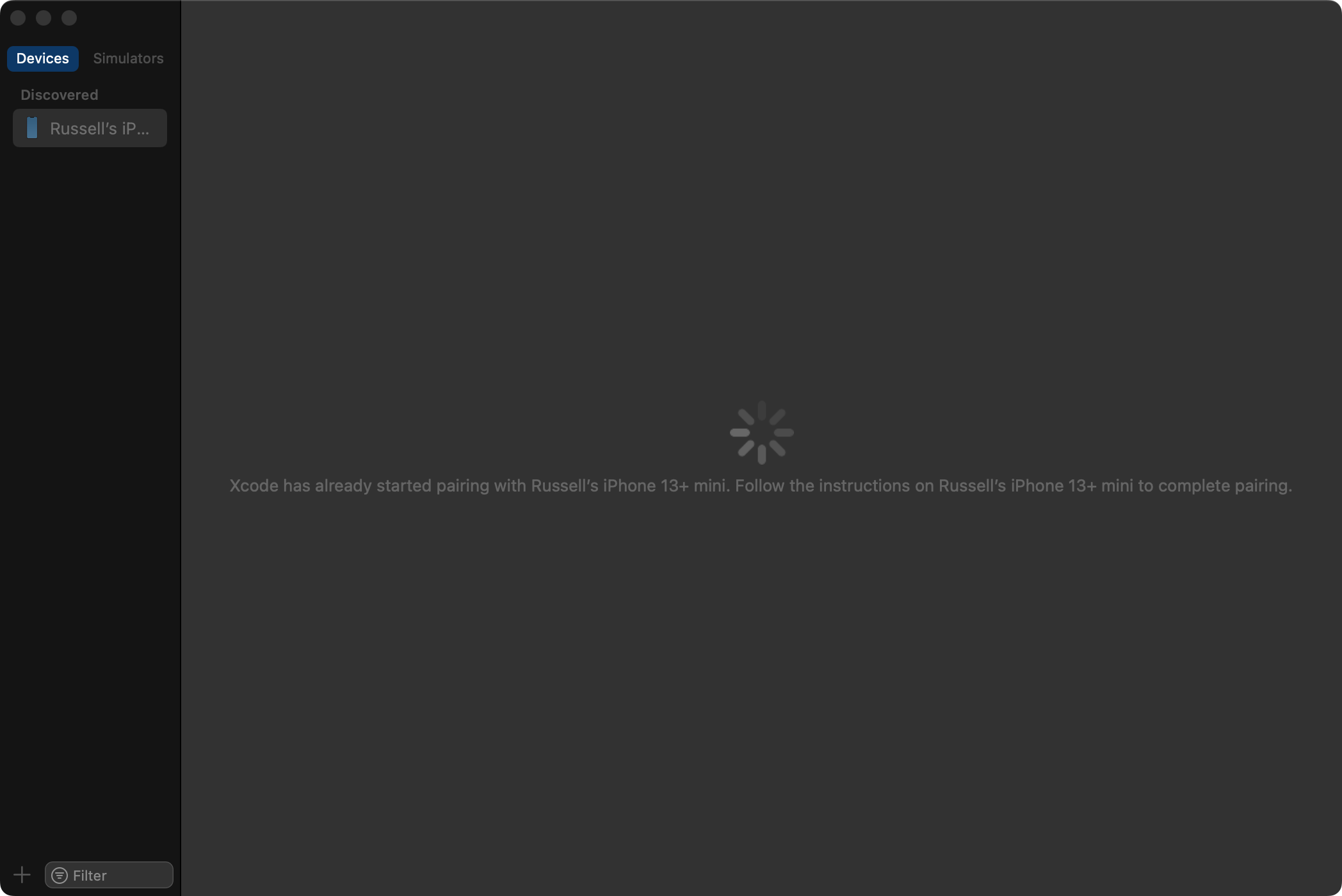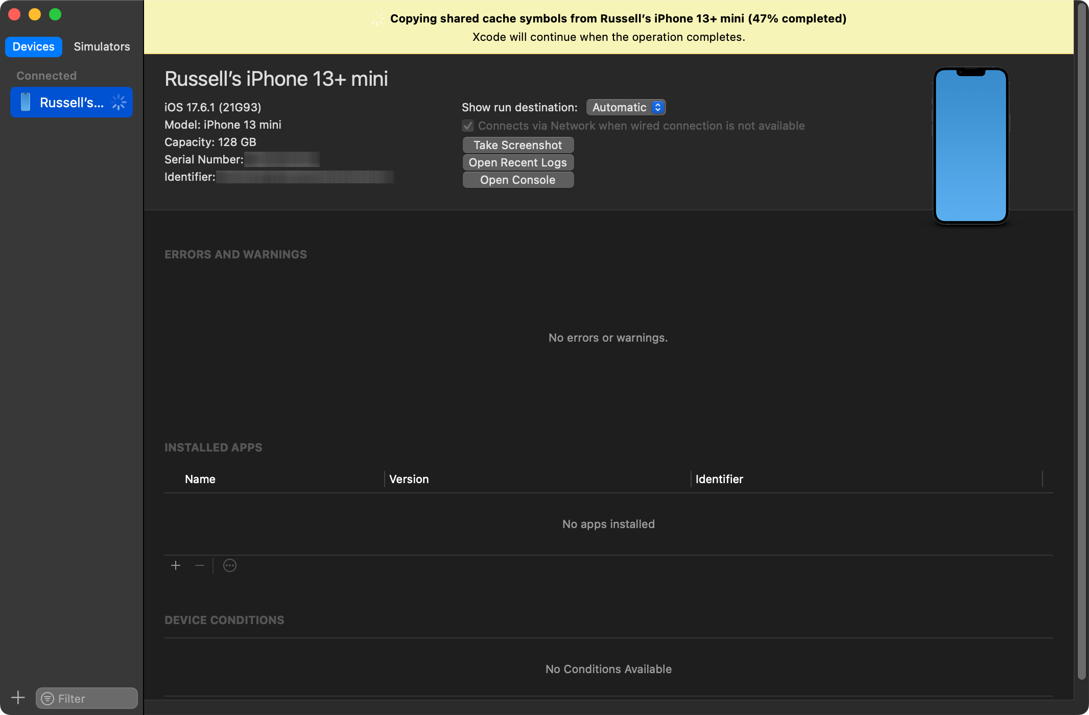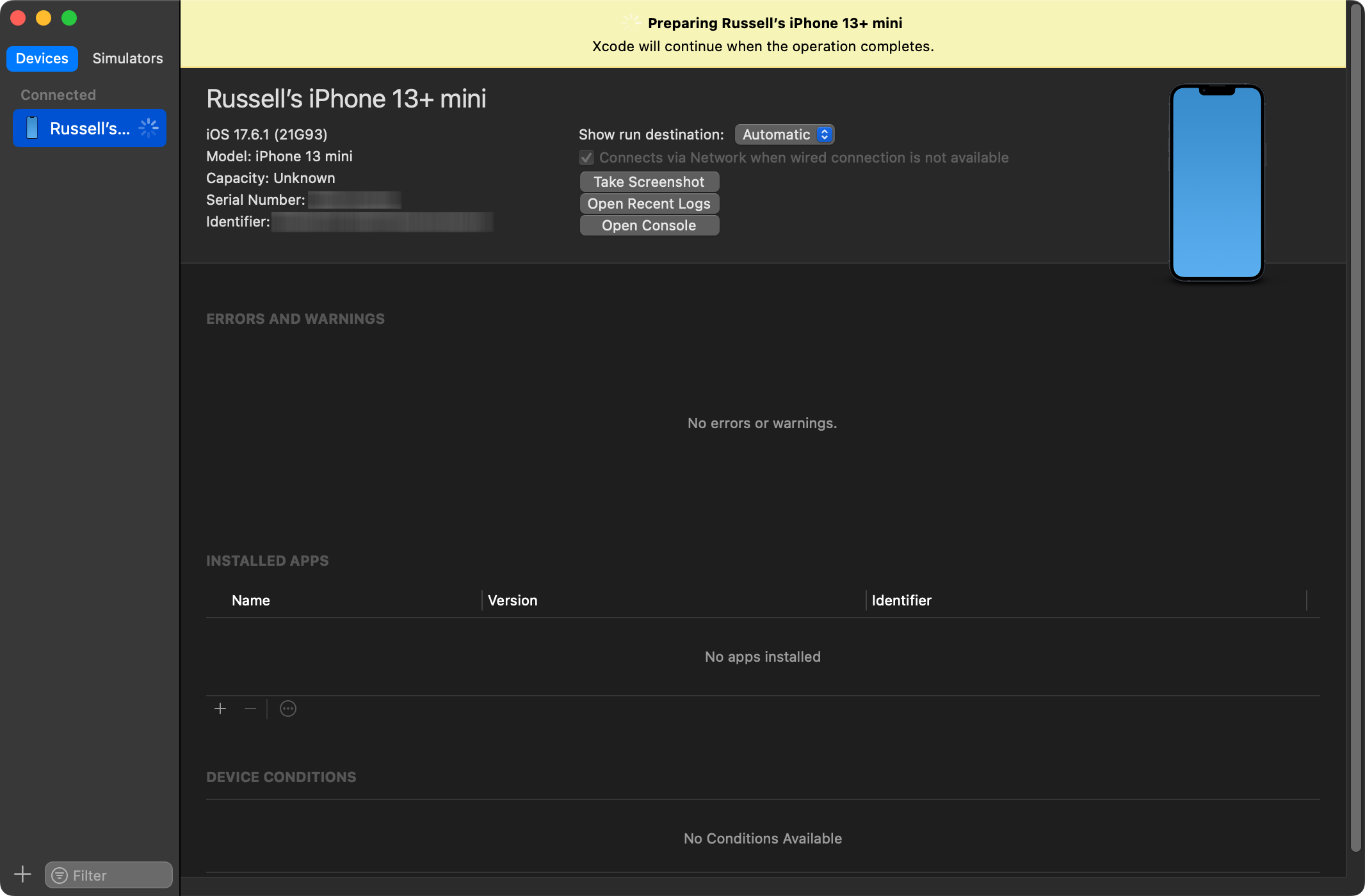 After a few moments, you should see the “Preparing…” message in the Devices and Simulators dialog: