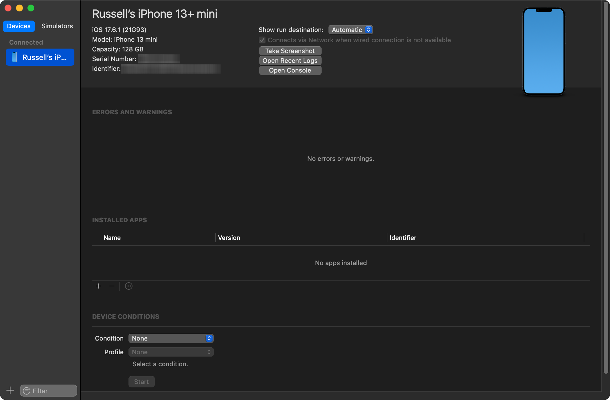 Now, you can select the device you’ve connected as a run destination.