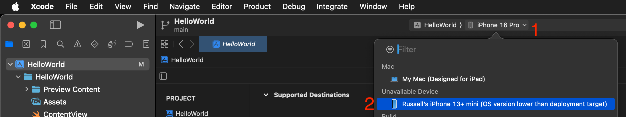 That means that the phone itself is running a version of iOS that is older than the version of iOS the Xcode project is configured to run on. In this example, Mr. Gordon’s phone is running iOS 17, but the project is configured to run on iOS 18.