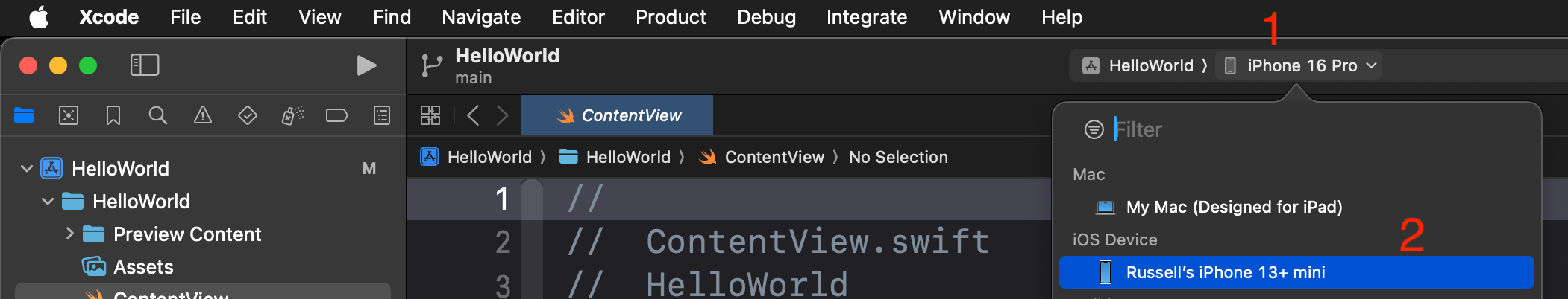 At the top of the primary Xcode window, click the list of devices (1), then select your device from the list (2):